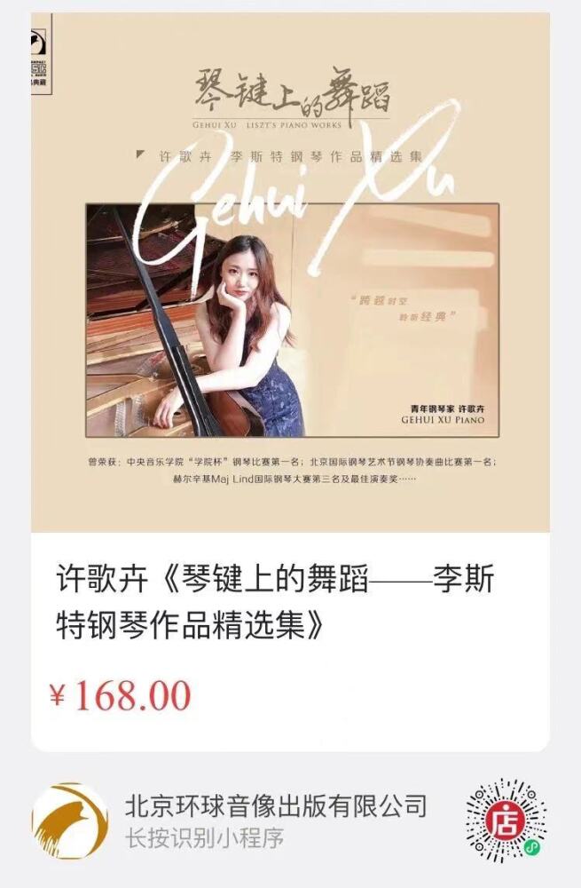 许歌卉《琴键上的舞蹈——李斯特钢琴作品精选集》已上线北京环球音像出版有限公司微店,欢迎大家长按二维码跳转选购!