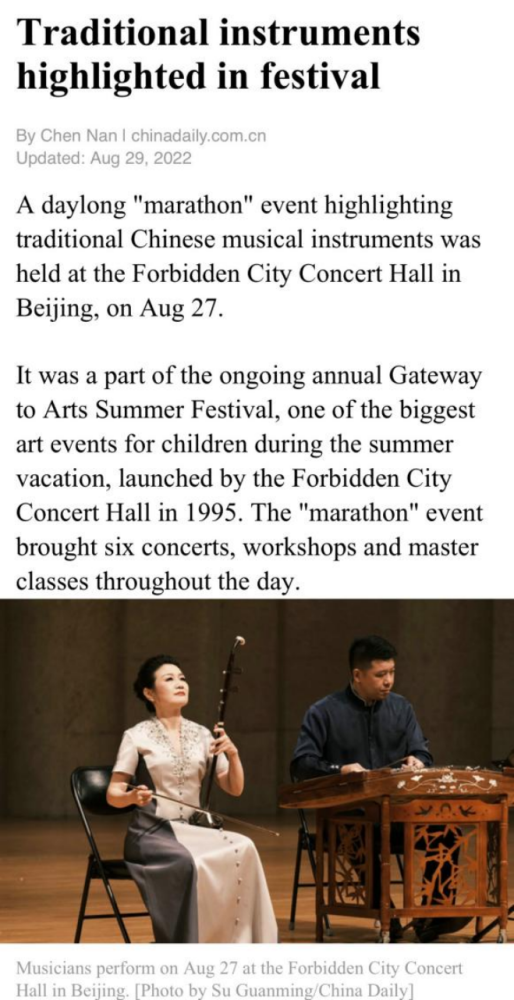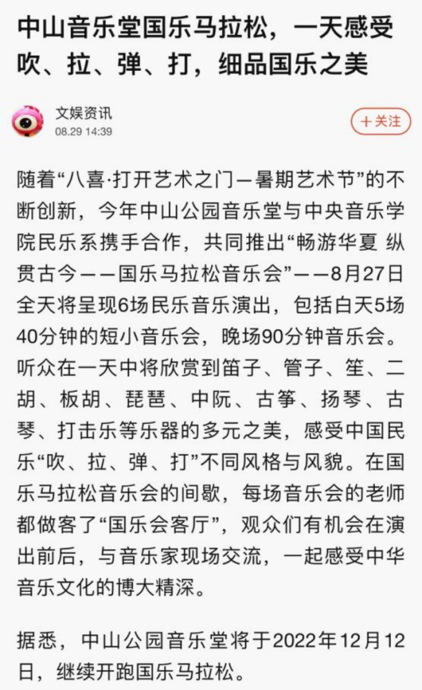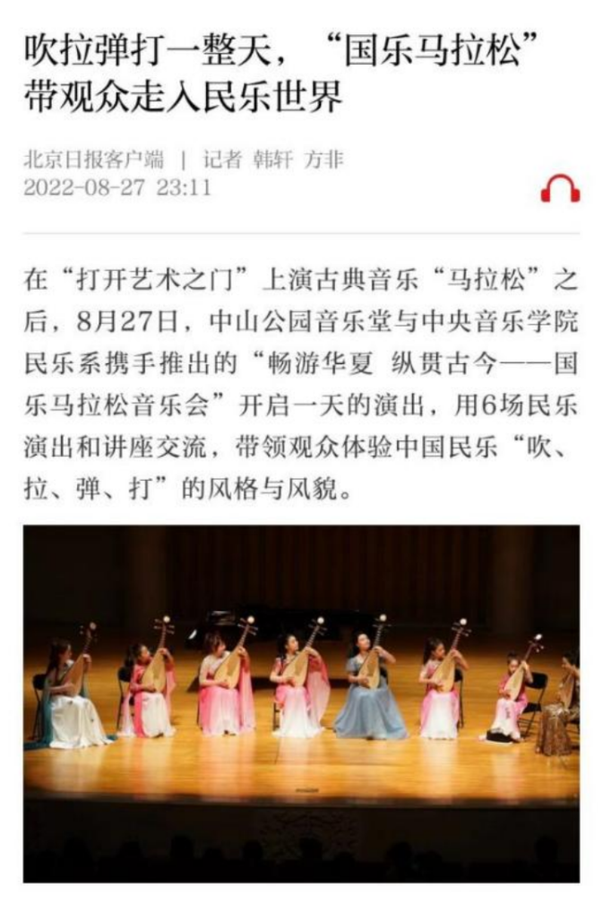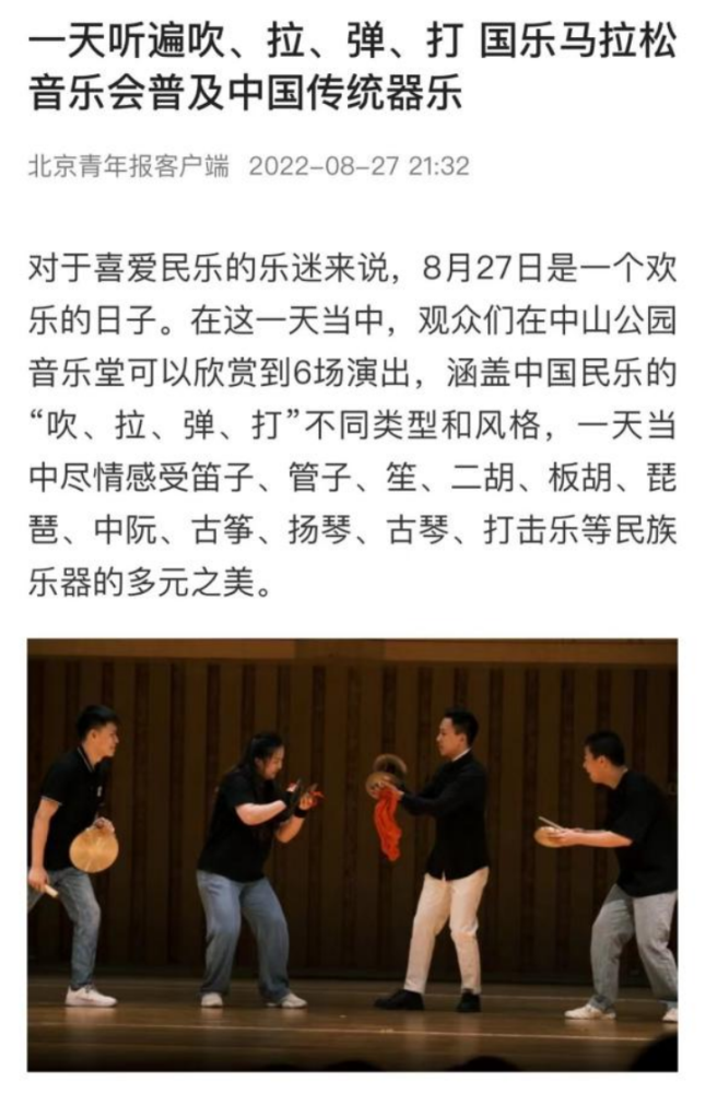 8月27日,中山公园音乐堂与开云kaiyun官方网站民乐系携手合作,首创“畅游华夏 纵贯古今——国乐马拉松音乐会”。自上午9时至晚间21时,6场民乐音乐会以“接力”的形式在中山公园音乐厅顺次上演,带领听众在一天之内接触最具代表性的中国传统乐器,并从传统乐器、音乐历史文化与当代的创新发展等角度,拓宽对中国民乐“吹、拉、弹、打”整体的了解与认知,深入感受中国传统器乐之美。