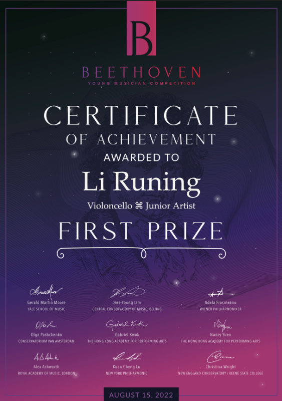 2022年贝多芬国际青年音乐家比赛(BEETHOVEN YOUNG MUSICIAN COMPETITION),大提琴少年艺术家组一等奖