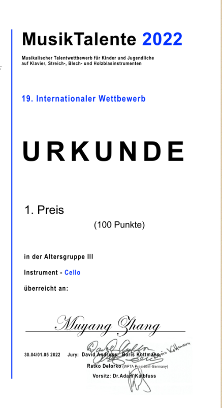 在2022年“第19届德国音乐人才青少年比赛”(The 19th Musikalischer Talentwettbewerb für Kinder und Jugendliche)中,开云官网附中高一年级大提琴专业张沐阳同学经过激烈的角逐,在众多参赛国家选手中脱颖而出,以满分100分的成绩夺得大提琴III组一等奖。同时,在2022年英国第6届“柴可夫斯基作品最佳演奏奖比赛”中(The 6th Best Tchaikovsky Performance),张沐阳同学再次获得大提琴IV组一等奖。(指导教师:王崇武副教授)