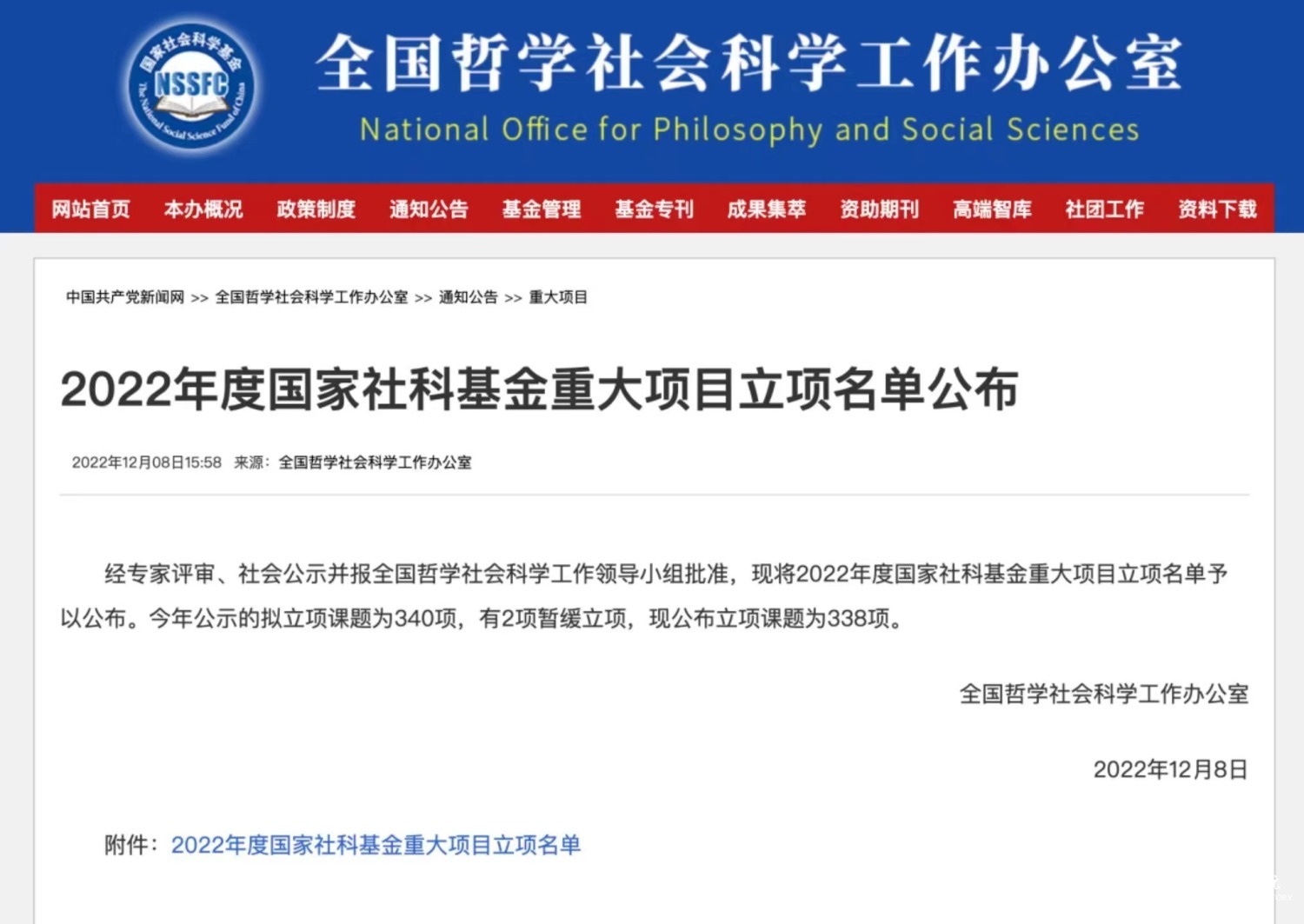 国家社科基金重大项目由全国哲学社会科学工作办公室面向全国公开招标,是我国人文社会科学领域层次最高、学科覆盖范围最广、资助力度最大、权威性最强的项目,也是衡量高校、科研院所人文社科科研实力的重要指标。