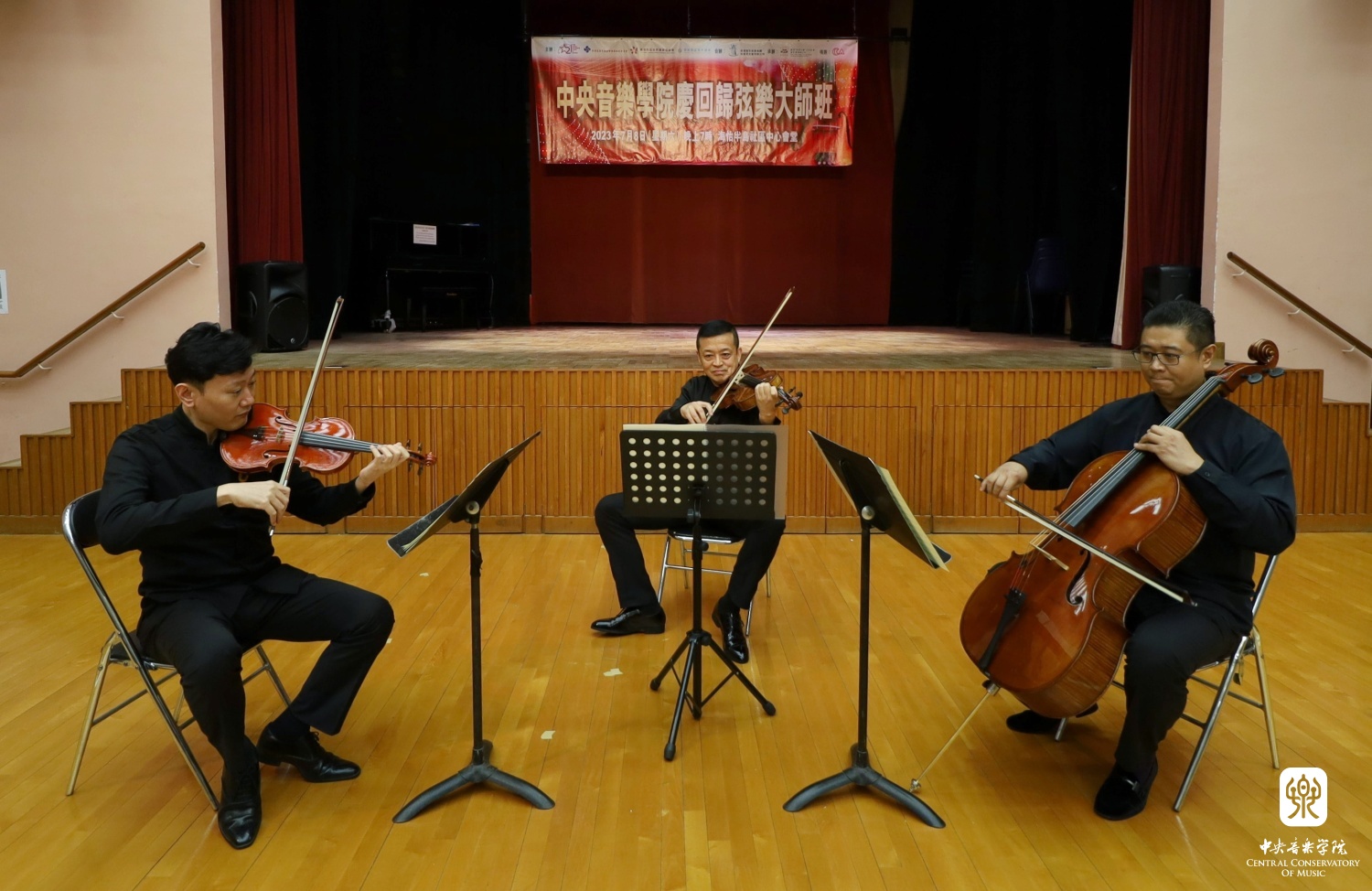在香港回归祖国26周年之际,开云官网党委统战部、港澳台办精心组织、统筹安排,选派管弦系陈曦、曹海、杨锰三位优秀教师组成弦乐三重奏,于7月7月至10日赴港参加由香港“希望之声”少儿慈善基金会主办的系列庆祝活动。