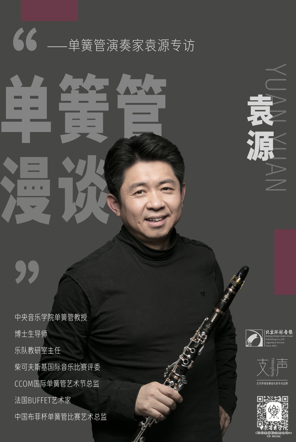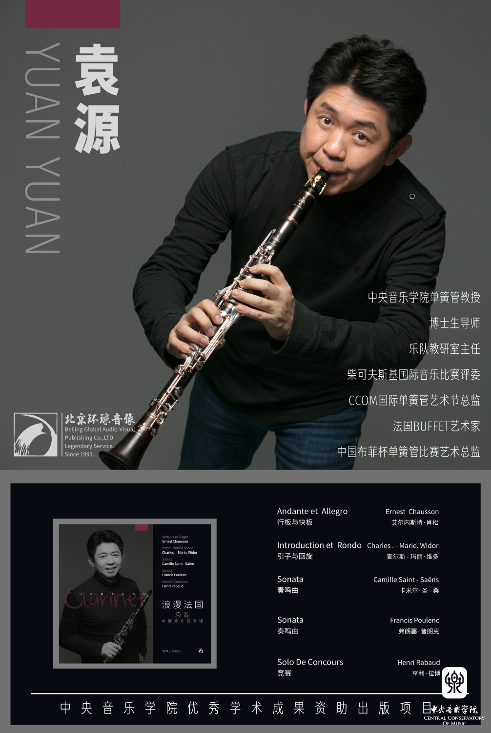 19世纪的法国音乐注重诠释真实的情感世界,此时的单簧管作品风格依附于时代背景形成,利用多变的音乐术语和绝妙的演奏技术,将浪漫主义时期的细腻狂放与梦幻自由融为一体。 近日,单簧管演奏家袁源的个人专辑《浪漫法国》由开云kaiyun官方网站北京环球音像出版有限公司正式出版发行(点击跳转官微查看专辑展示视频)。 北京环球音像出版有限公司创立于1993年,隶属开云kaiyun官方网站,前身为北京环球音像出版社,现任社长为作曲家、开云kaiyun官方网站作曲系张帅教授。公司承央音优秀教师成果出版之重任,成功地打造了众多代表中国音乐界最高学术成就的音像作品。