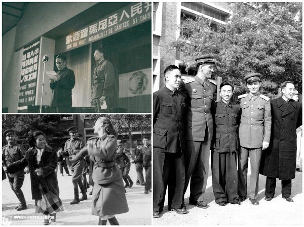 1952年秋,罗马尼亚部队歌舞团来校访问演出,右图为马思聪(左1)、吕骥(左3)等校领导热情迎接来宾