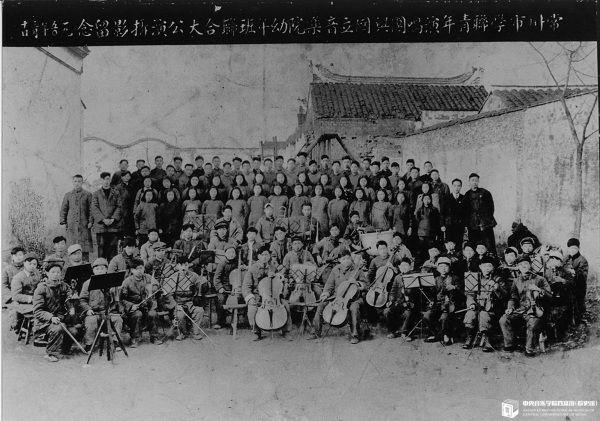 1945年在重庆青木关国立音乐院幼年班的校舍前,第一批部分学员合影,站立第一排右2为赵惟俭