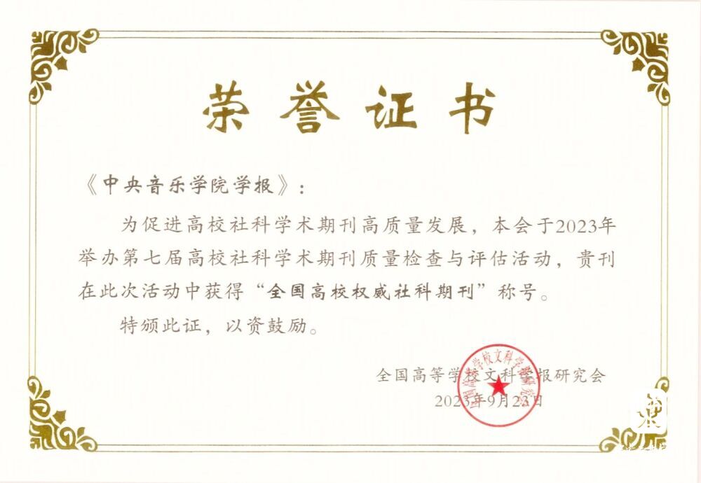 2023年9月23日,在宜昌三峡大学召开的第七届“高校社科学术期刊质量检查与评估”颁奖大会中,《开云kaiyun官方网站学报》获颁最高评级“全国高校权威社科期刊”荣誉称号,是全国唯一入选“权威社科期刊”的艺术类高校学报。