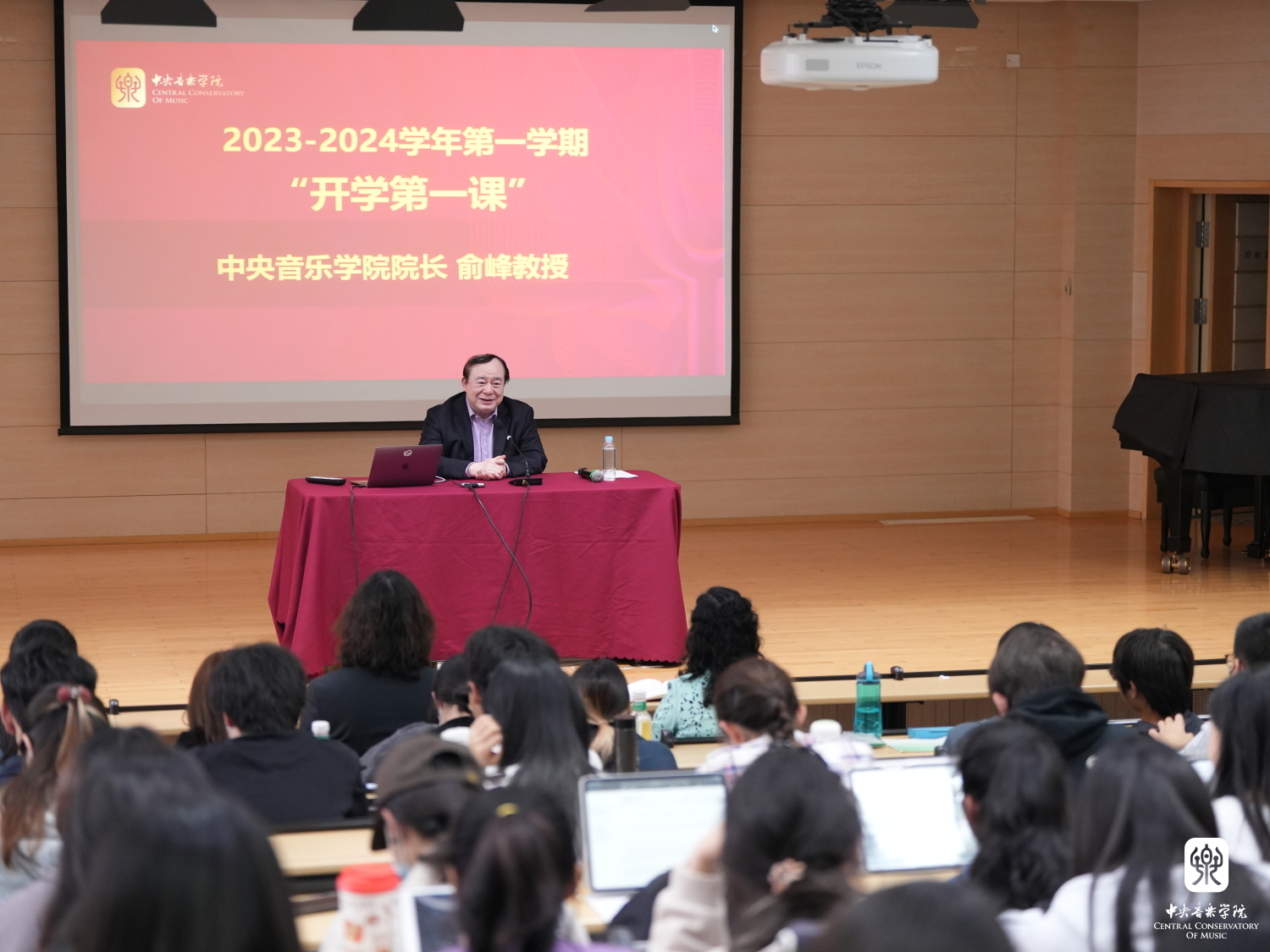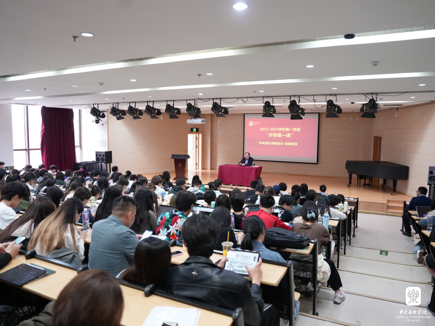 2023年10月12日下午,俞峰院长以“百年复兴强国梦,矢志文艺报国情”为主题,在教学楼401为学校近200名学生讲授“开学第一课”。
