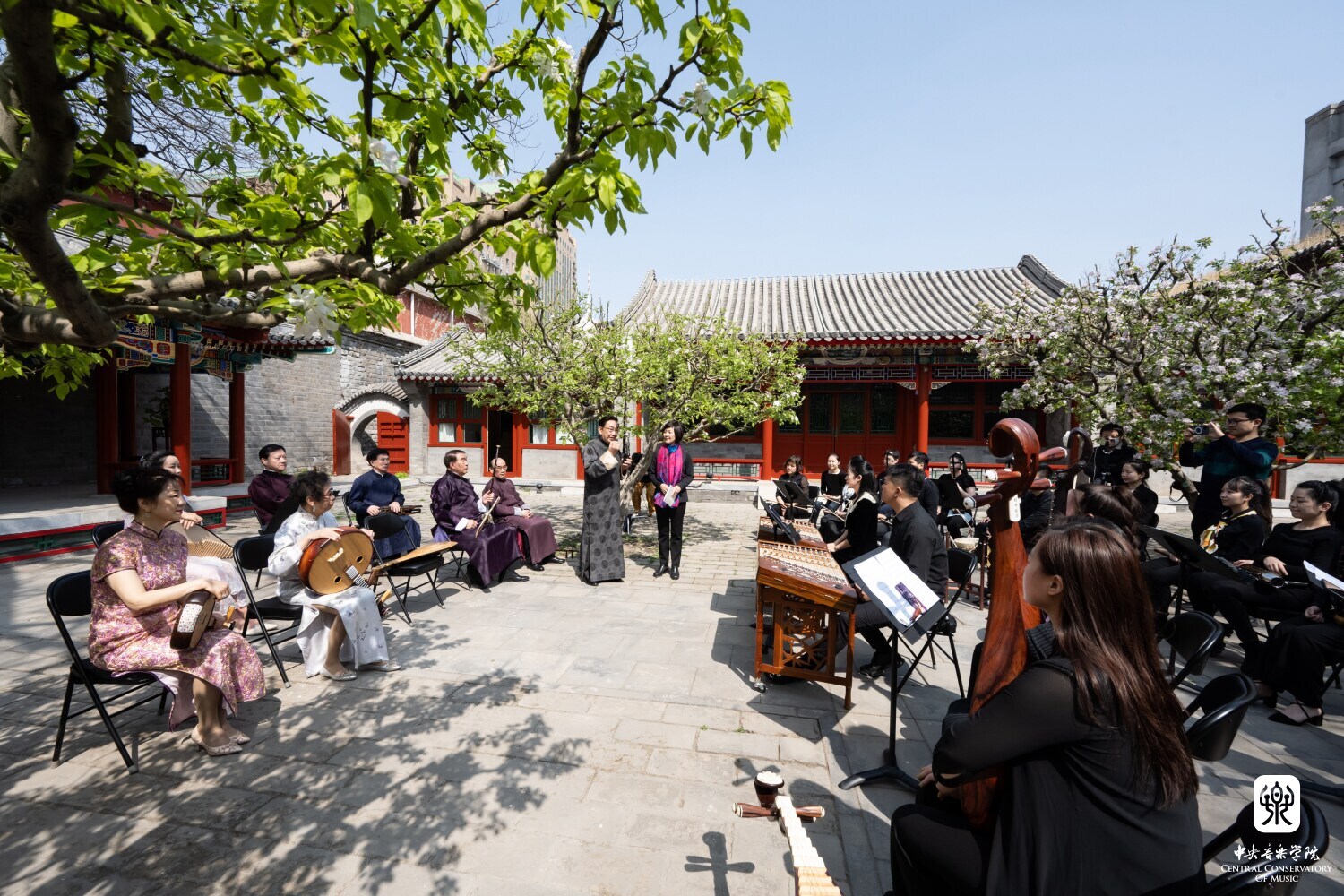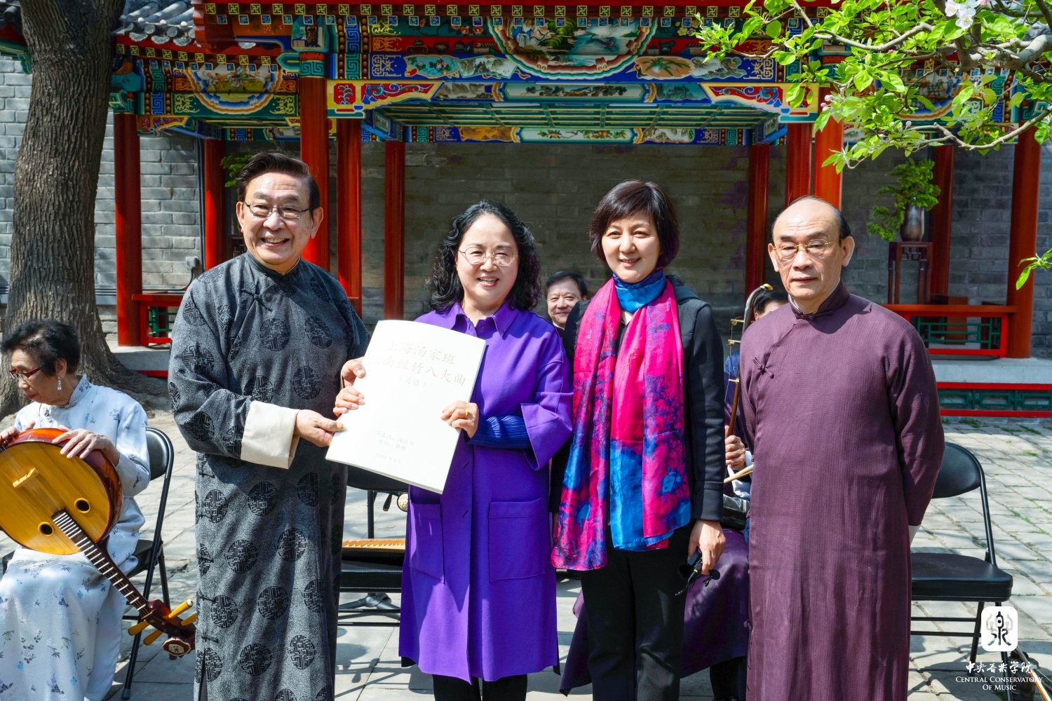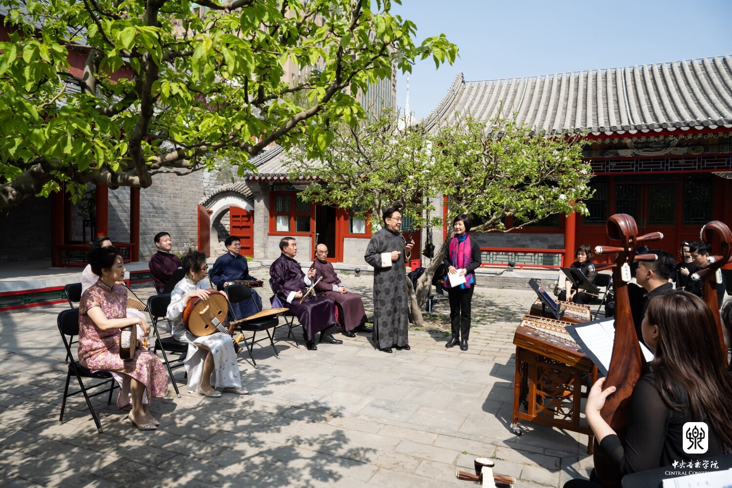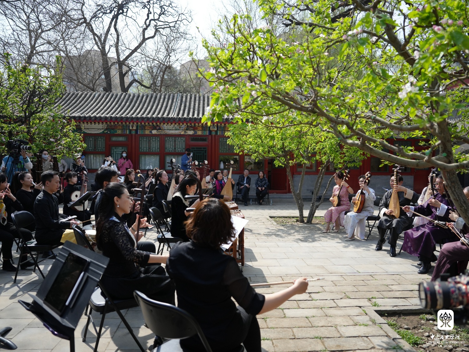 在章红艳教授的邀请下,“汤家班”又展示了传统艺术家交换乐器即兴配合的高超技艺,带来了一曲沪上风格鲜明的《紫竹调》。悠扬婉转的曲调回荡在王府西小院的青砖红墙之间,伴着随风飘落的海棠花瓣,观者沉浸在美妙的艺术享受当中。