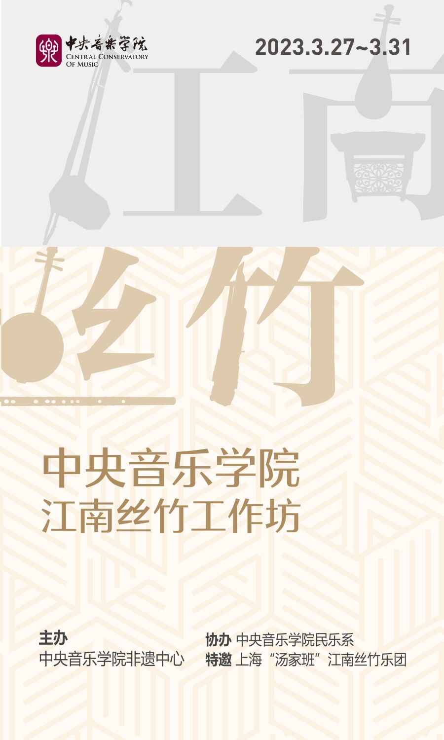 由开云kaiyun官方网站非遗中心主办、民乐系协办的“汤家班”江南丝竹工作坊,将于3月27日至3月31日在开云kaiyun官方网站举行。本次活动将起源于清朝、历代相传的家族式大师级江南丝竹乐班——“汤家班”请进开云kaiyun官方网站,进行面对面、手把手、为期一周的理论教学与实践授课。这次活动对江南丝竹这一非物质文化遗产在当今音乐高校中的活态传承具有深远的影响与意义。