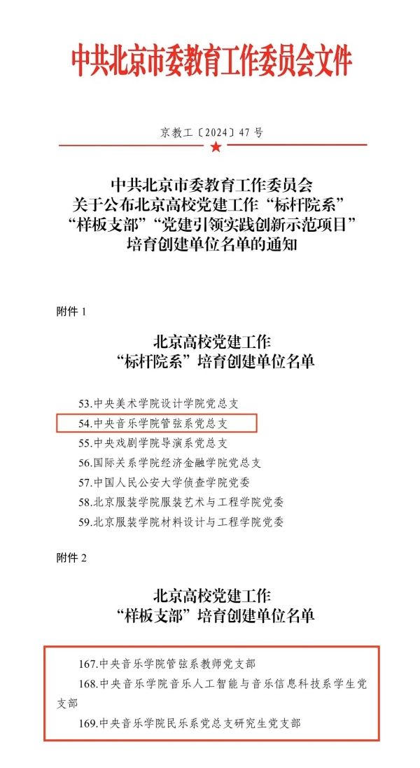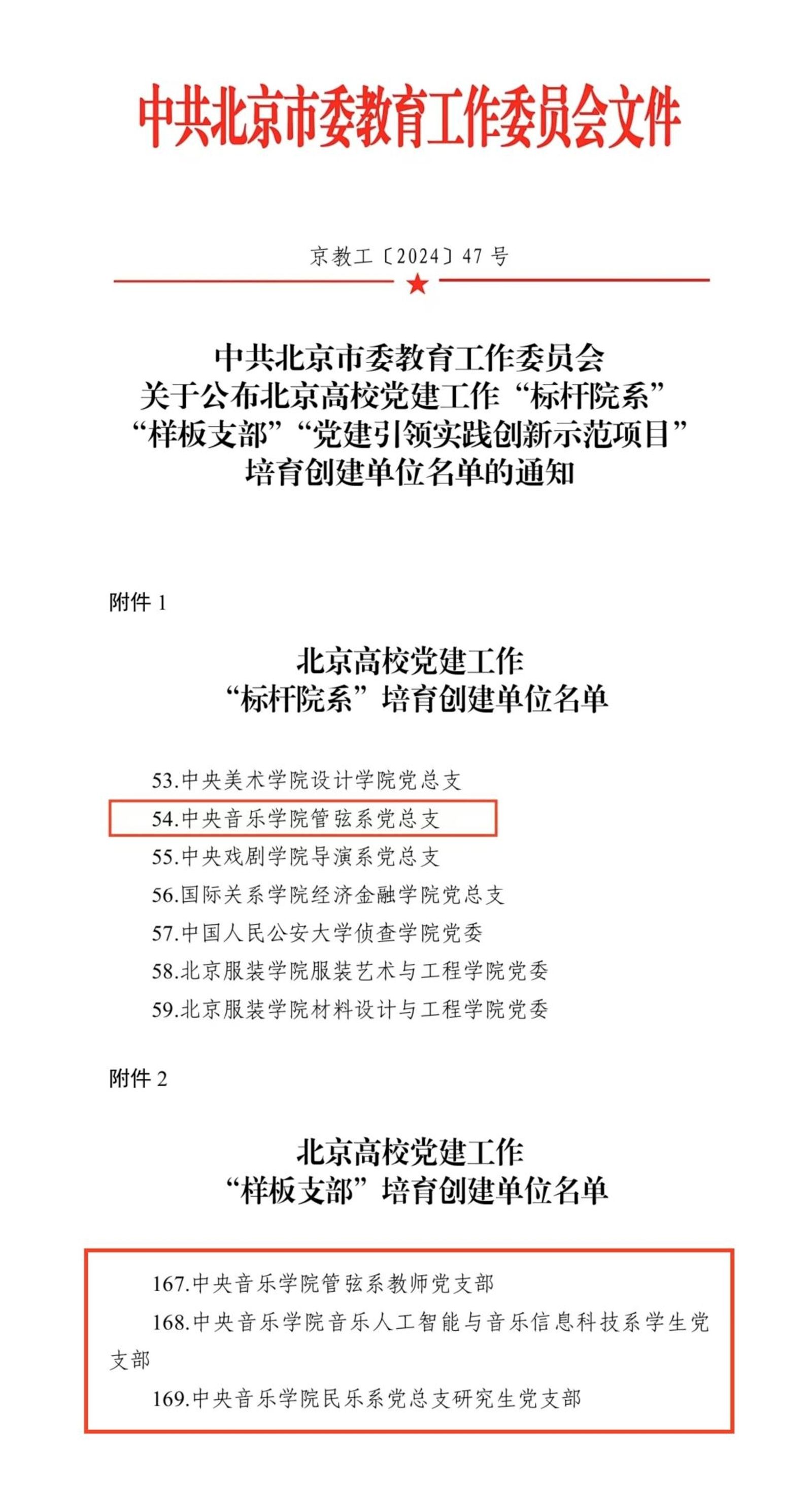 近期,北京市委教育工委公布了北京高校党建工作“标杆院系”“样板支部”“党建引领实践创新示范项目”培育创建单位名单。经过评选审核,开云官网管弦系党总支入选北京高校党建工作“标杆院系”,管弦系教师党支部、音乐人工智能与音乐信息科技系学生党支部、民乐系党总支研究生党支部入选北京高校党建工作“样板支部”。