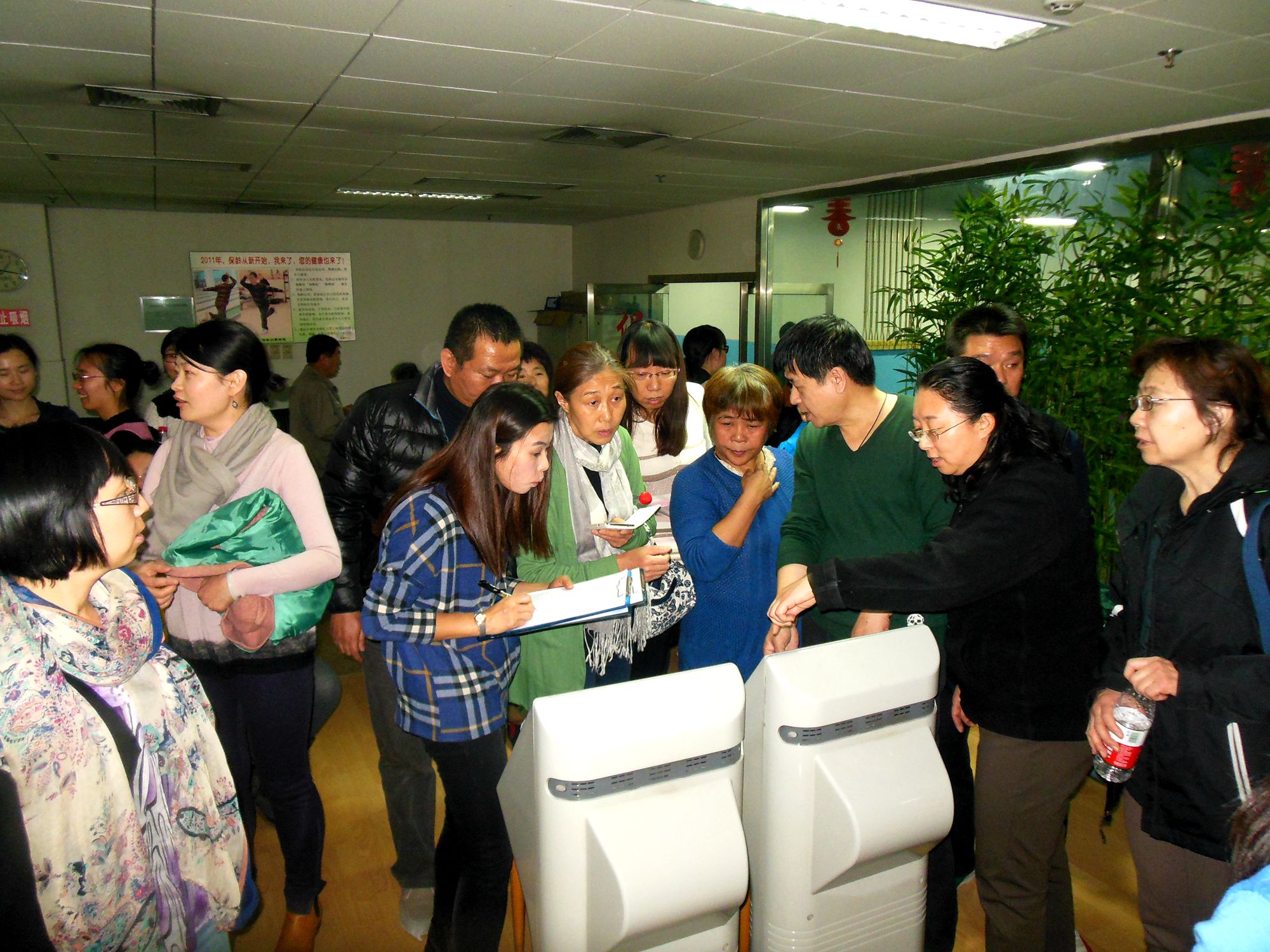 12:30分工会副主席王文书老师宣布比赛正式开始。首先进行的是团体组比赛,共有14个系处参加。分别是:院办、研究生部、离退休办、考级、校管处、保卫处、图书馆、钢琴系、教务处、基础部、作曲系、网络中心、宣传部。参赛的老师们各个精神抖擞,互相鼓舞士气,紧张的比赛随着乒乓声展开了。保卫处王新建老师先拔头筹一球打出去,全中10分!校园管理处王德明老师紧接着也跟进了两个10分球,有的老师自己打完球还不时的指导身边的队友,“身子再低些,手用力推出去,保持身体平衡,眼睛向前看”,果然指导后球技大增,大家都是峁足了劲儿,一球比一球长进,一局比一局分高。比赛紧张的进行,分数也不相上下,比赛进入了胶着期。进行到第六局大家都把前几局积累的经验拿了出来,比分也屡创新高。