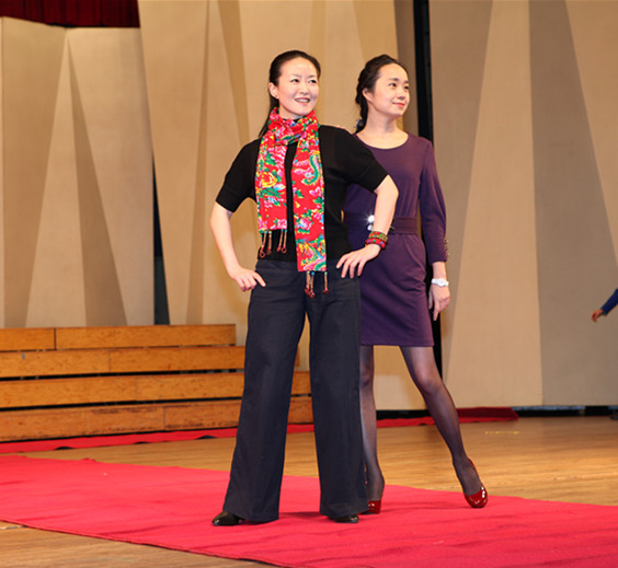 而后民俗协会的老师们表演了绝活抖空竹、踢毽。各系的辅导员老师们一改往日的严肃形象,也不示弱表演了歌曲串烧,赢得了阵阵喝彩。教务处处长徐之彤老师别有心意的把学院老师的名字串在了《给校友的一封信》里,让大家耳目一新,鼓掌叫好声不时响起,又一次将联欢会推向了高潮。最后一个压轴节目是学院行政、系各部门代表表演的《T台走秀》,节目既展示了各部门的文化与朝气,又给了一直在幕后为学院发展默默奉献的行政老师们一次舞台展示的机会。虽然在镁光灯下老师们的神情略显紧张,当展示出部门的对联与横幅时,喜悦兴奋之情溢于言表。