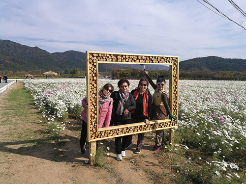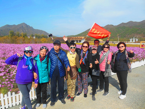 第一站我们带领老同志们参观泉山花海,它位于怀柔桥梓镇口头村。花海以群山为衬,清泉为界,在蓝天白云下,格外喜人。花海总体设计为玉如意形状,从空中鸟瞰,与远处青山、流沙河、近处亭台形成一幅彩色山水画卷。