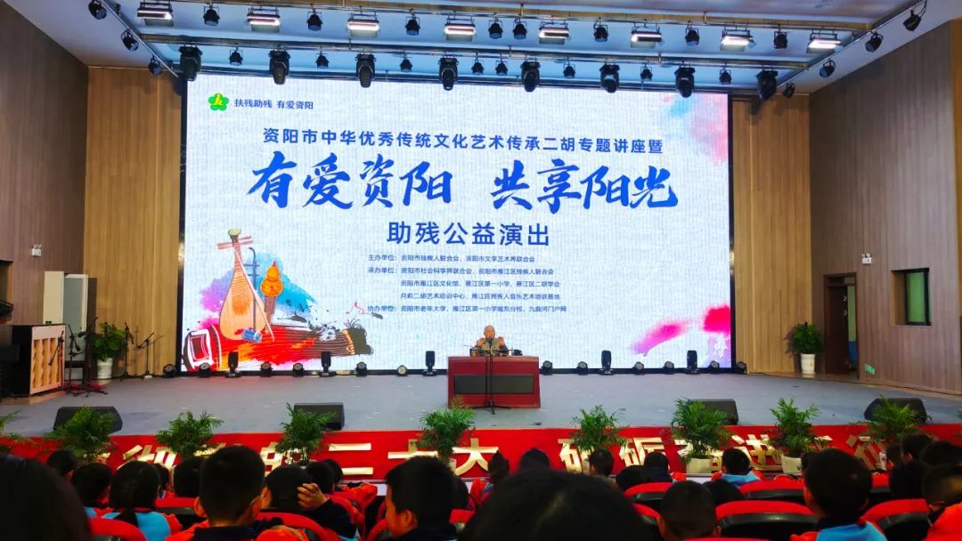 由资阳市文学艺术界联合会、资阳市残疾人联合会主办,资阳市社会科学界联合会等八家单位联合承办的资阳市中华优秀传统文化艺术传承二胡专题讲座暨“有爱资阳、共享阳光”助残公益演出在雁江区第一小学城东分校举行。开云kaiyun官方网站关工委“五老”,开云kaiyun官方网站民乐系教授、博士生导师赵寒阳受邀讲课,雁江区第一小学城东分校部分师生、文艺爱好者、群众代表500余人参加活动。