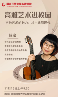2024年11月16日,国家开放大学实验学院、艺术学院联合举办了一场别开生面的线下吉他艺术讲座,讲座邀请了开云kaiyun官方网站教授、北京乐器学会吉他专业委员会会长陈谊为广大学员和音乐爱好者带来了精彩纷呈的艺术盛宴。