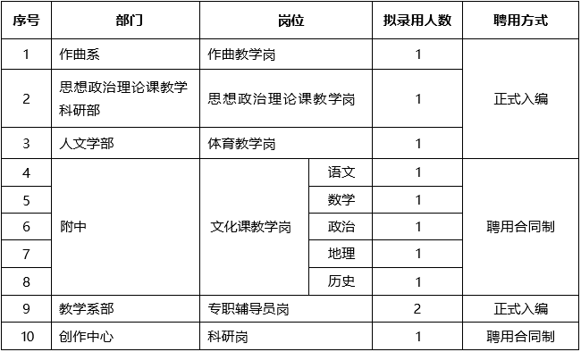 1.教学岗(作曲教学岗、体育教学岗、思想政治理论课教学岗、附中文化课教学岗)
