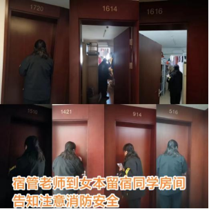 3.全面检查学生公寓的水、电安全,反复对每个宿舍进行易燃易爆等危险品及违规电器进行排查,无人留宿宿舍确保已关门、关窗、断电;多次对有学生留宿宿舍进行安全检查。