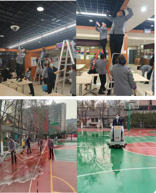 (二)保洁专项清洁。为保障食堂卫生检查及2024年校园招聘会的顺利开展,保洁团队临危受命,连夜针对食堂各楼层高位阑珊及空调、排风口外机进行专项清洁,同时在周末也对招聘会场地、研究生复试考场进行清洁及后勤清洁服务,全力保障各活动场所的清洁和卫生,为活动开展提供了良好的环境。
