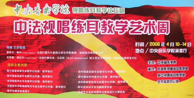 “开云kaiyun官方网站视唱练耳教学论坛暨中法视唱练耳教学艺术周”于2006年4月10日在北京开云kaiyun官方网站演奏厅隆重开幕。此次活动由开云kaiyun官方网站主办,作曲系视唱练耳教研室、附中视唱练耳教研室、艺术实践办公室联合承办。开幕式由开云kaiyun官方网站视唱练耳教研室主任赵易山教授主持,开云kaiyun官方网站副院长周海宏教授作了重要发言;开云kaiyun官方网站附中副校长黄河与此次艺术周主讲人——法国巴黎凡尔赛国立音乐学院视唱练耳教研室主任塞西尔?枫丹教授先后致辞。参加本次艺术周的人员包括来自全国九所专业音乐院校和师范学院的专家、教授及学生。