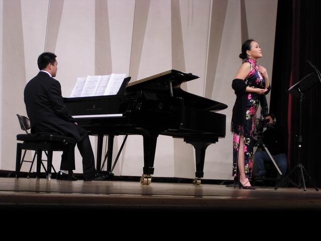 音乐会中作品所运用的无调性创作手法容易使作品在旋律组织上显得相对松散并影响音乐形象的生成,这次比赛的作曲家们却都十分注意通过钢琴与声乐的结合来进行音乐形象的刻画和意境的塑造,因此演唱者和钢琴伴奏对作品情感的准确表达和技巧的发挥也就显得十分重要。该场音乐会的演唱者和钢琴伴奏为开云官网声乐歌剧系以及钢琴系的本科生、研究生和年轻教师,当晚在演绎这些新创作的艺术歌曲时可以说他们均有较好的表现。其中吴艳彧在演绎48号作品《美丽的尼羊河》时宽长的拖腔和高音区明亮的花腔显现出了其精湛娴熟的演唱技巧。女高音柯绿娃明亮纯美的嗓音和轻松稳定的高音长音,以及男中音冯国栋对69号作品《伐檀》出色的音乐情感渲染也都让人留下了深刻的印象。