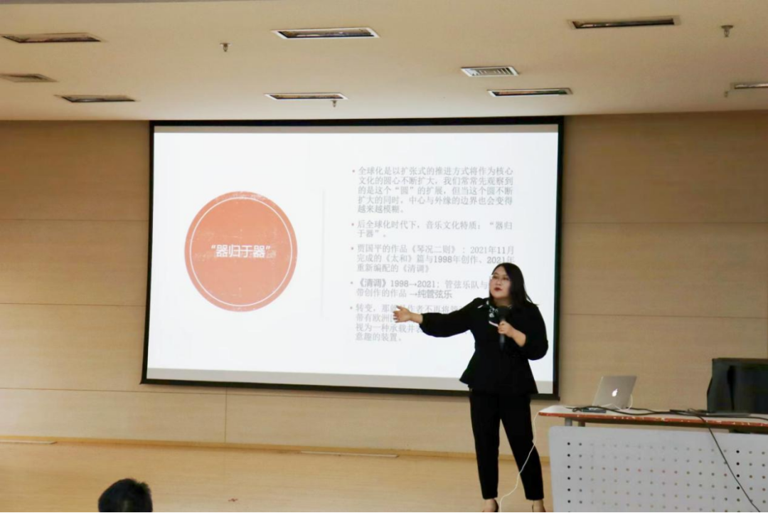 第三位演讲者2022级音乐美学方向博士研究生何毓奇以《器归于器,乐求于魂——后全球化时代下的器乐审美观》为题,演讲过程中逻辑清晰、观点明确、语言精练,生动展示了全球化对中国音乐创作的影响,给在场观众留下难忘的印象。