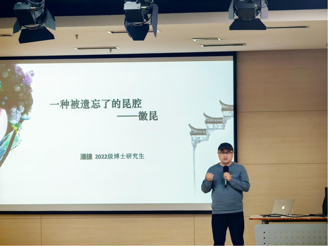 第五位演讲者2022级中国传统音乐方向博士研究生潘捷以《一种被遗忘了的昆腔——徽昆》为题,将徽昆的历史流变娓娓到来。他深入浅出地对徽昆的板眼符号、伴奏乐器等进行讲解,并就徽昆在当下的传承提出独到的观点。他与上一位演讲者互为呼应,共同向观众们展示中华古老文明的珍贵遗产。