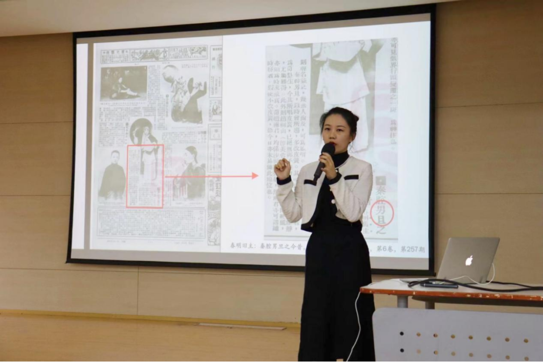第四位演讲者2022级中国古代音乐史方向博士研究生潘俊汝以《清代男性旦脚:跨越角色性别的艺术结合体》为题,通过扎实的历史文献研究,自信从容的姿态,简明利落的展示,梳理清代男性旦脚角色的演变,在场观众听得兴趣盎然,意犹未尽。