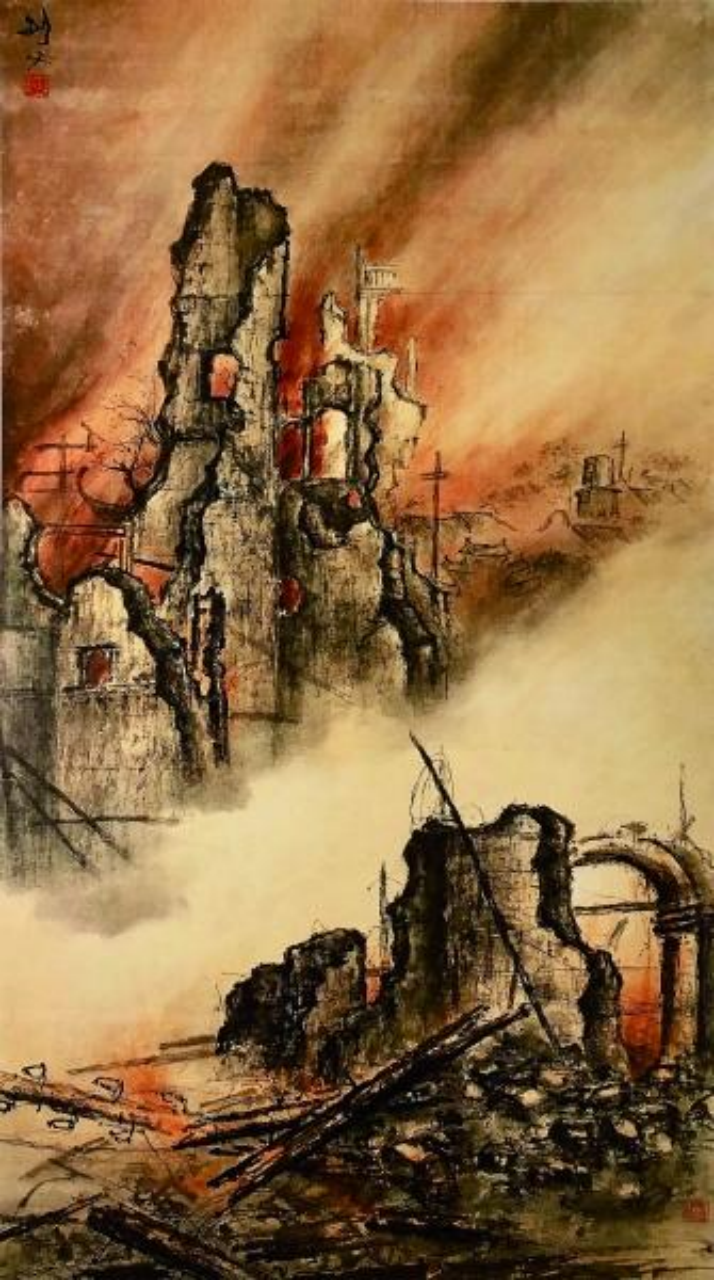 刘博雅的《东战场的烈焰》创作灵感来自中国近代画家高剑父的同名作品(如图2[3])。在这首作品中,作曲家对于不同乐器中新音色的探索引人注目,如在单簧管中所使用的“下牙轻抵哨片”而发出的不稳定极高音,巴松模仿打击乐效果的“舌击音”以及二胡在极高音区快速运弓所模仿的“风声”等等。在作品的前两部分,作曲家正是通过对这些新音色的运用而使听众仿佛身临枪林弹雨、炮火呼啸之境;作品的第三部分由雨棍所模仿的“雨声”引入,二胡时而拨奏时而敲击琴筒,音乐在不同乐器间不断传导,并在断续中逐渐走向连绵,钢片琴轻灵的敲击仿佛天外来客轻盈的步履生怕惊醒这饱受伤痛的土地,最终音乐走向沉寂。“山河破碎风飘絮,身世浮沉雨打萍。”这富于哲思的音乐仿佛已经令我们跨越了时空的距离,让我们亲身回到那段特殊的岁月里,去体悟,去思索。