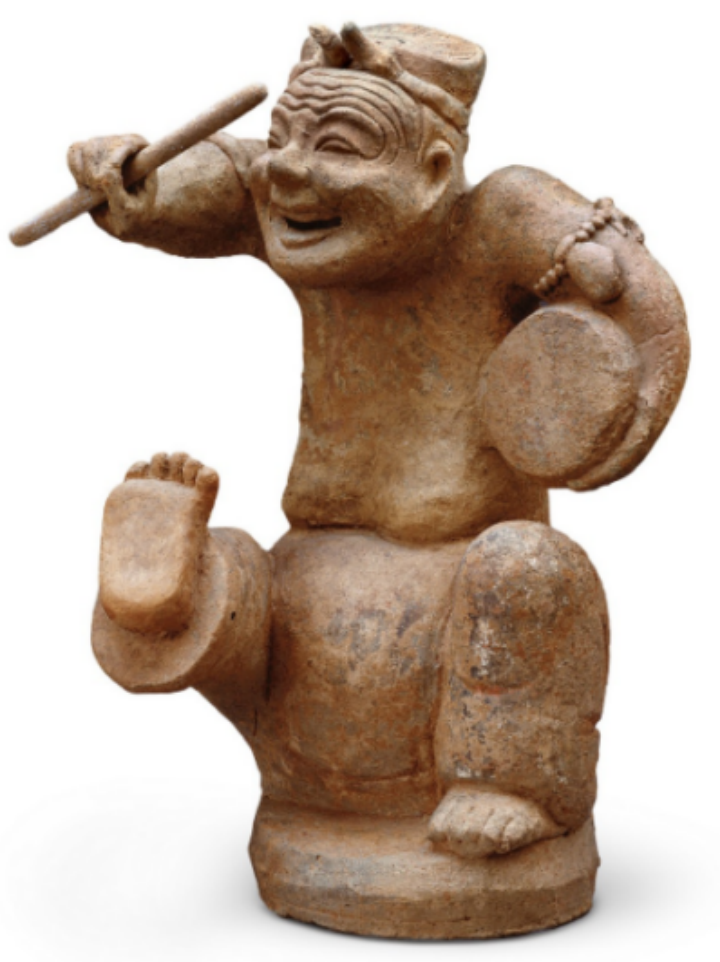 马晗蕊的《俑·悦享之境》创作灵感来源于东汉击鼓说唱俑(如图4[5])。东汉时音乐的具体面貌或许“遥响难追”,但作曲家以个人敏锐的洞察力感受到这件来自千年前的古物身上所流露出的发自内心的快乐。作品以规整的节奏作为背景,在小提琴、二胡、琵琶以及中阮分合协行的律动中,追寻着来自千年前的快乐。《礼记·乐记》有云:“唯乐不可以为伪。”[6]沧海桑田间时光流转,但这份发自内心的快乐是如此的真挚,又如此的感人。“乐者,乐也!”正是在这梦觉之间,音乐跨越了时空,乐耶?喜耶?梦耶?醉耶?