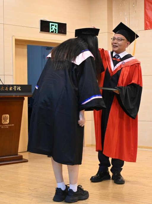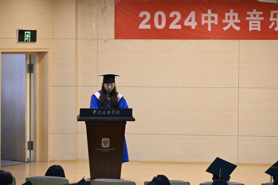 硕士毕业生代表王雅各回顾了自己与央音结缘十年以来的心路历程和成长,她诚挚地感谢了一路走来曾帮助过她的音乐学系的老师们,并特别感谢了音乐学系这片温暖而深厚的土壤对于她的养育,让她希望自己能成为一名有抱负、有良知、坚信初心的人。最后,王雅各鼓励同学们能够不负学校培养,在各个岗位上共同成为新一代的中坚力量。
