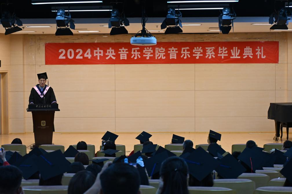 本科毕业生代表杨其睿结合自己在音乐学专业的学习经历与感想,以及对于音乐学系学风、学统的个人思考,探讨了他心中“央音音乐学系的光芒”。杨其睿特别感谢音乐学系浓厚的学术氛围和追求真理的学术风尚,他鼓励同学们在未来的人生中继续带着这一份优秀的传统前行,并表达了对大家真心的祝愿和期许。