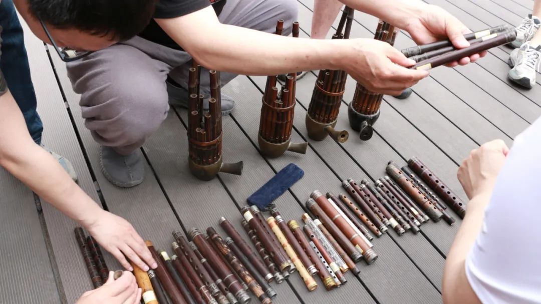 演出结束后,胡庆学老师从工作间中取出自己珍藏的众多乐器,与大家交流分享。他收藏的数十根管子让大家大开眼界,这数十根管子材质多样,其中有乌木的、漆皮的、竹制的、锡制的,甚至有他自制的亚克力制管,一些管子上还绘有“双喜”“寿”“万”字等图案。这些管子来源甚广,有来自河北的对管、山西的小管、安徽的锡管等等。在胡庆学老师的收藏中,也不乏抽屉式储藏大小哨片的“哨筒子”这种精巧器具。随后,胡庆学老师为大家介绍了他收藏的四支笙,四支笙的笙底纹样各有不同。在这些古老的乐器中,我们窥见了其中蕴含的古朴韵味与悠久的历史文化。据胡庆学老师说,他修复过很多笙,在他的办公桌上,我们看到了很多待组装的散落笙苗,在办公桌的另一边,是胡庆学老师的小小“直播间”,而智化寺京音乐这样富有古朴雅韵的“活化石”,也正因为有像胡庆学老师这样持之以恒的非遗传承人,这些宝贵的音乐文化遗产才能够被更多听众所了解,得到更好的保护与传承。