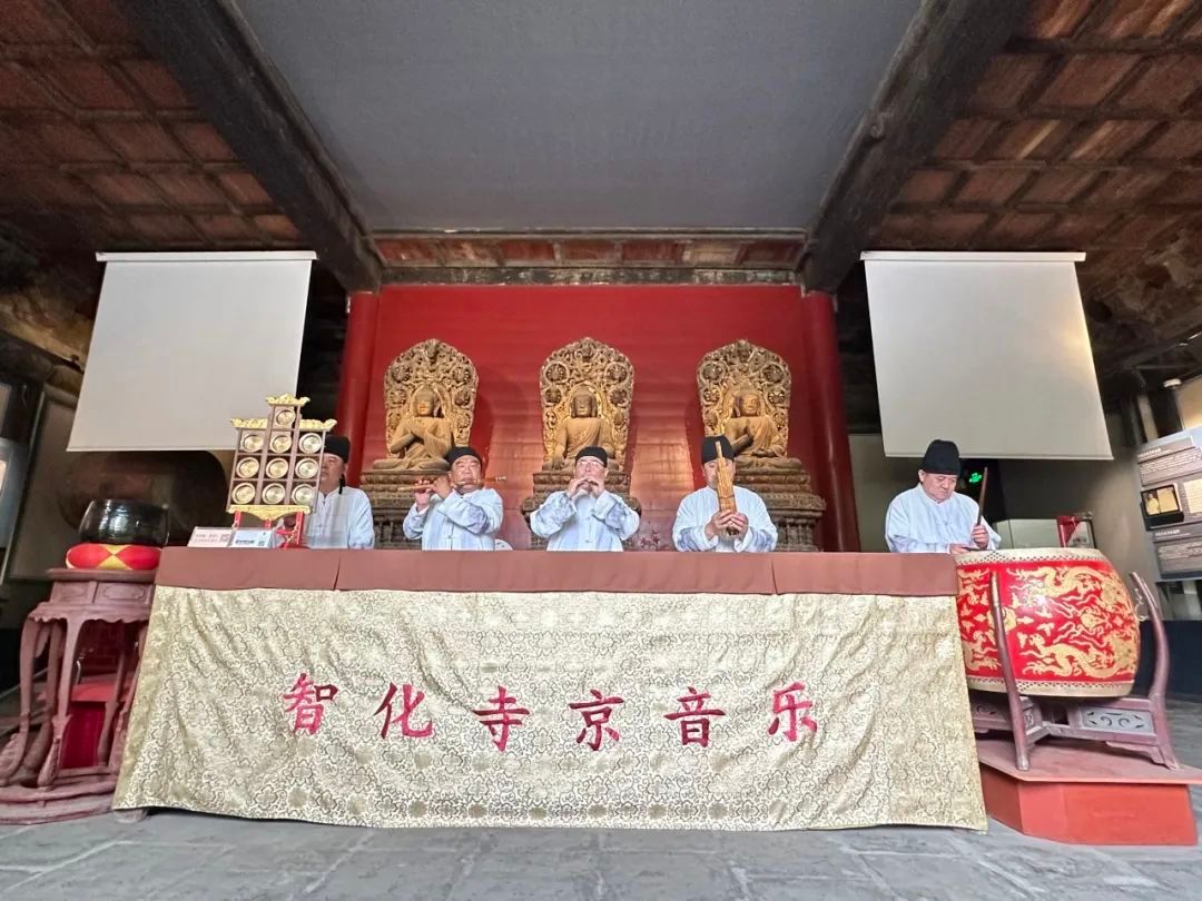 下午三点,胡庆学老师等第二十七代非遗传承人在智化殿中为参观的游客演奏智化寺京音乐【金五山】。在智化寺京音乐中,【金字经】【五声佛】【撼动山】经常联缀用于中堂套曲的尾部,旋律逐步融为一体,成为一首新的曲牌,名为【金五山】。管子古朴深邃,笛声活泼花俏,笙突出节奏韵律,云锣清音悦耳,鼓声强弱错落,几件乐器的律吕相和,余音绕梁,不仅展现了古老京音乐的魅力,也体现了第二十七代非遗传承人的精湛技艺。