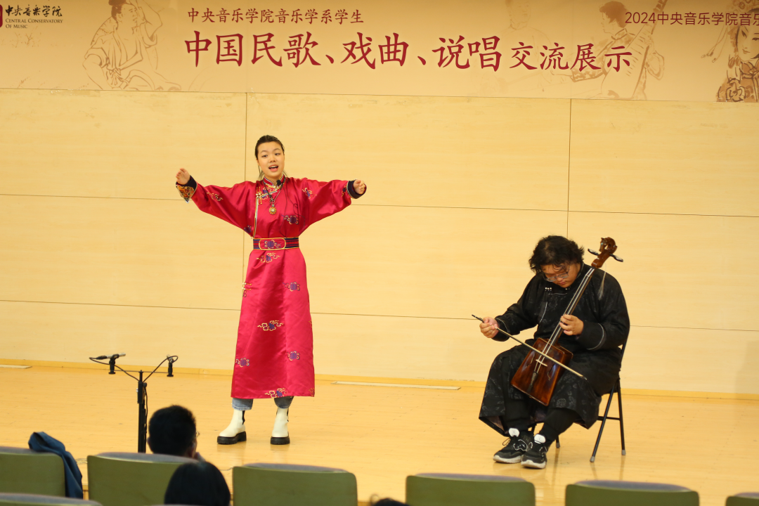 2023级音乐学本科生姚天杨与作曲系的乔瀚同学表演了蒙古族短调民歌《脑门达来》,马头琴悠扬的旋律与歌曲的深情表达相得益彰,展现着蒙古族人民的情感世界与文化底蕴。