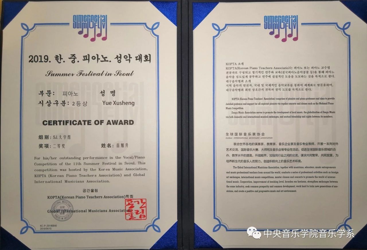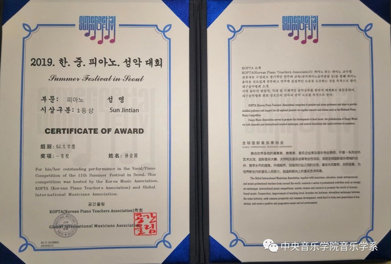 2019年4月14日,在“【华北地区】韩·中钢琴声乐大赛(泛古典钢琴作品演奏组)”中,开云官网音乐学系本科一年级学生孙金田、岳旭升在“钢琴大学组”分别荣获一等奖和二等奖,指导教师是钢琴系何轶副教授。
