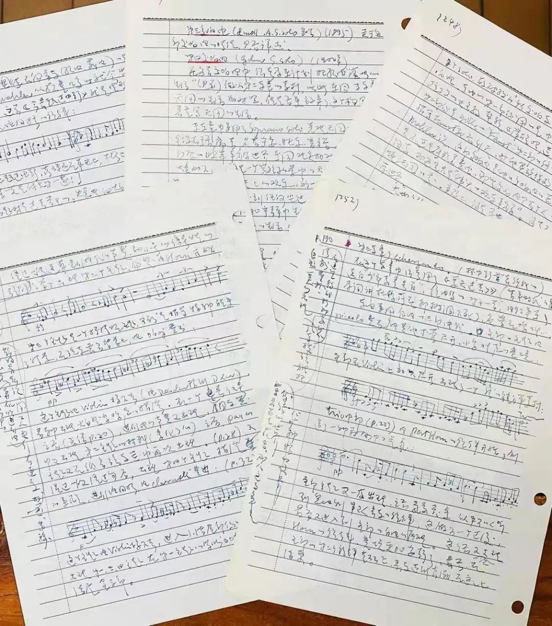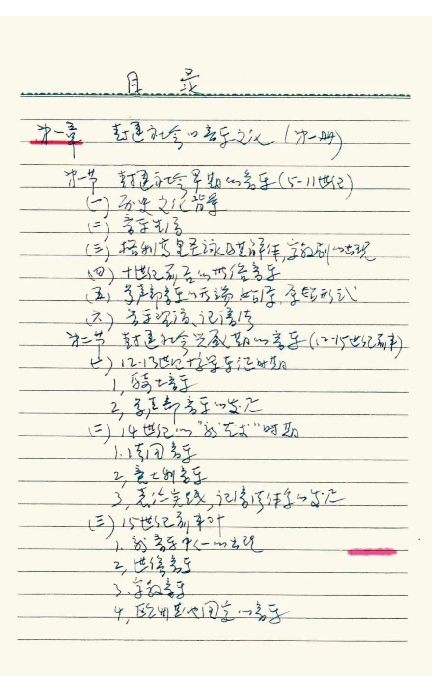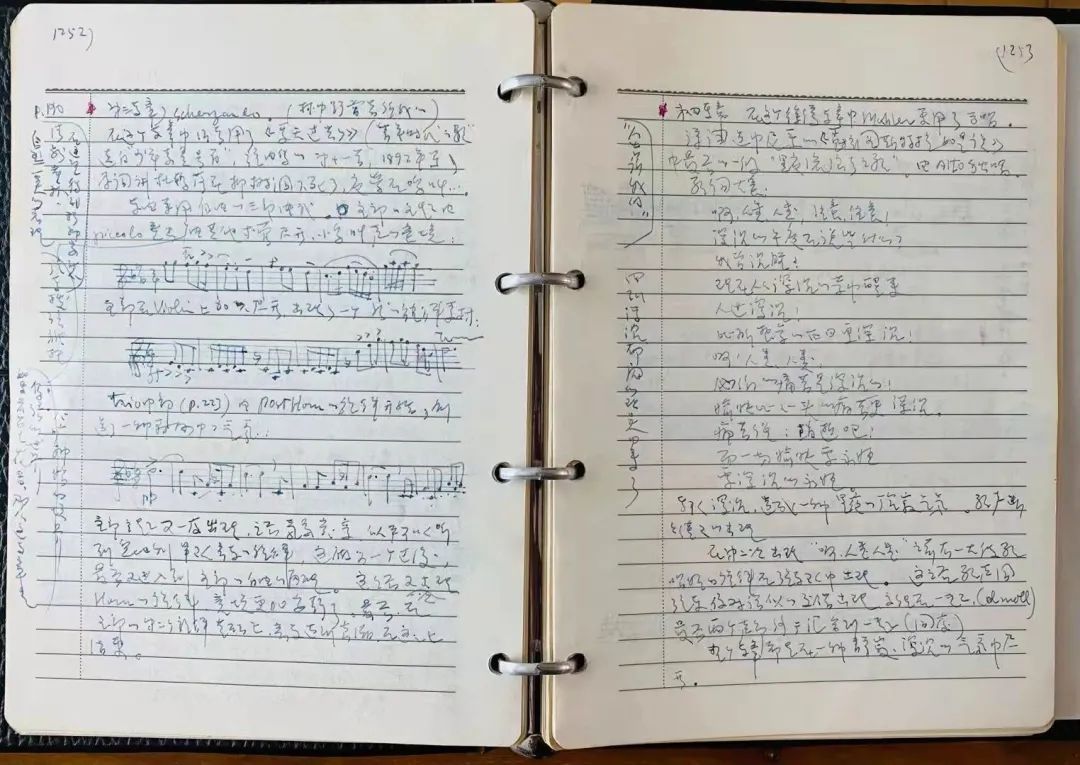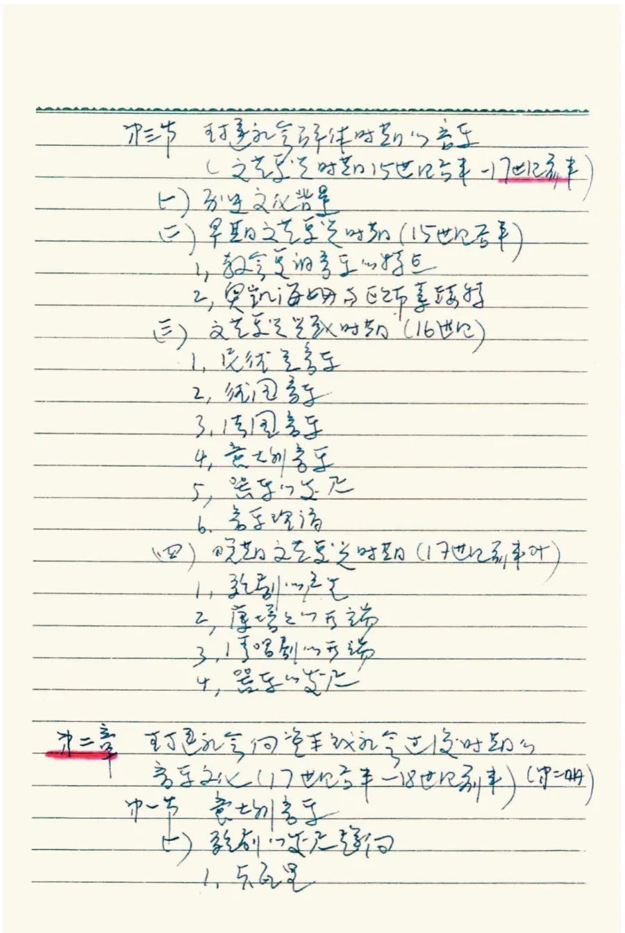 为了开设这门课,于润洋先生编写了近 2000页讲稿,共6章25节, 包含423条手绘谱例。从这沉甸甸的手稿和用钢笔绘制的乐谱中,可以看出于先生为开设这门课程所付出的心血。
