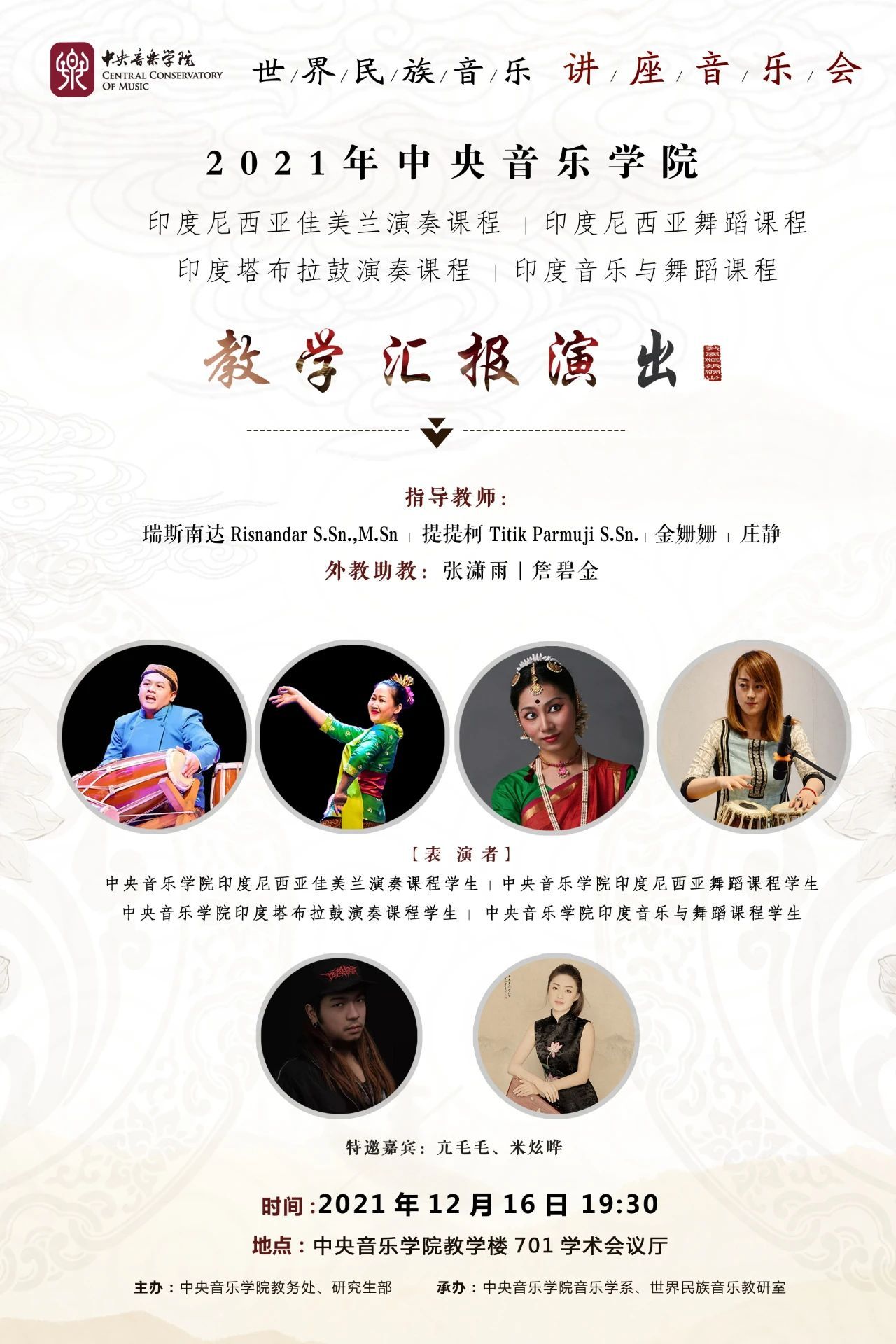 开云kaiyun官方网站世界民族音乐讲座音乐会为音乐学系世界民族音乐教研室开设的系列实践课程汇报演出。演出学生来自开云官网各个专业的本科、硕士以及博士研究生。他们在中、外名师的悉心指导下,学习了一学期《印度尼西亚佳美兰演奏》《印度尼西亚舞蹈》《印度塔布拉鼓演奏》以及《印度音乐与舞蹈》课程。本场演出是学生们跨文化、跨专业音乐实践学习成果的展示,也是世界民族音乐多元文化魅力的展示。演出配以相关节目的讲解,期待大家的光临!