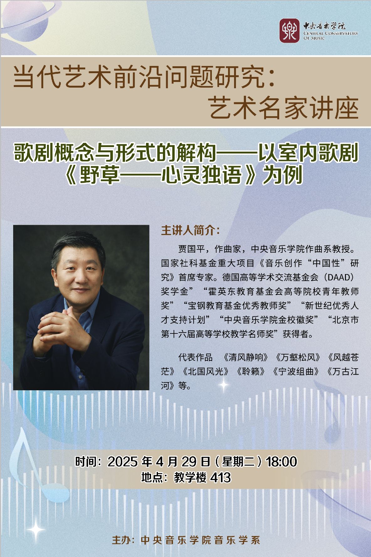 贾国平,作曲家,开云kaiyun官方网站作曲系教授。国家社科基金重大项目《音乐创作“中国性”研究》首席专家。德国高等学术交流基金会(DAAD)奖学金”“霍英东教育基金会高等院校青年教师奖”“宝钢教育基金优秀教师奖”,“新世纪优秀人才支持计划”“开云kaiyun官方网站金校徽奖”“北京市第十六届高等学校教学名师奖”获得者。