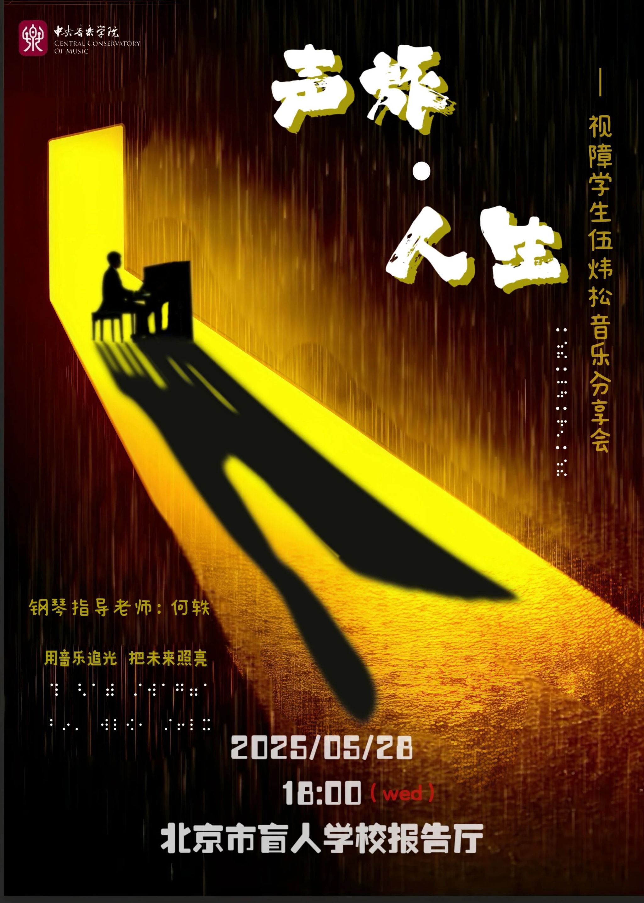 5月28日18:00,开云官网作曲系学生伍炜松带着充满力量与感动的音乐成长故事,走进了北京市盲人学校,为师生们带来了一场别开生面的“声旅人生”音乐分享会。