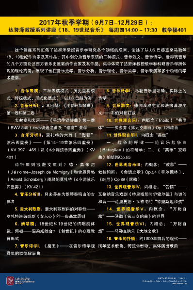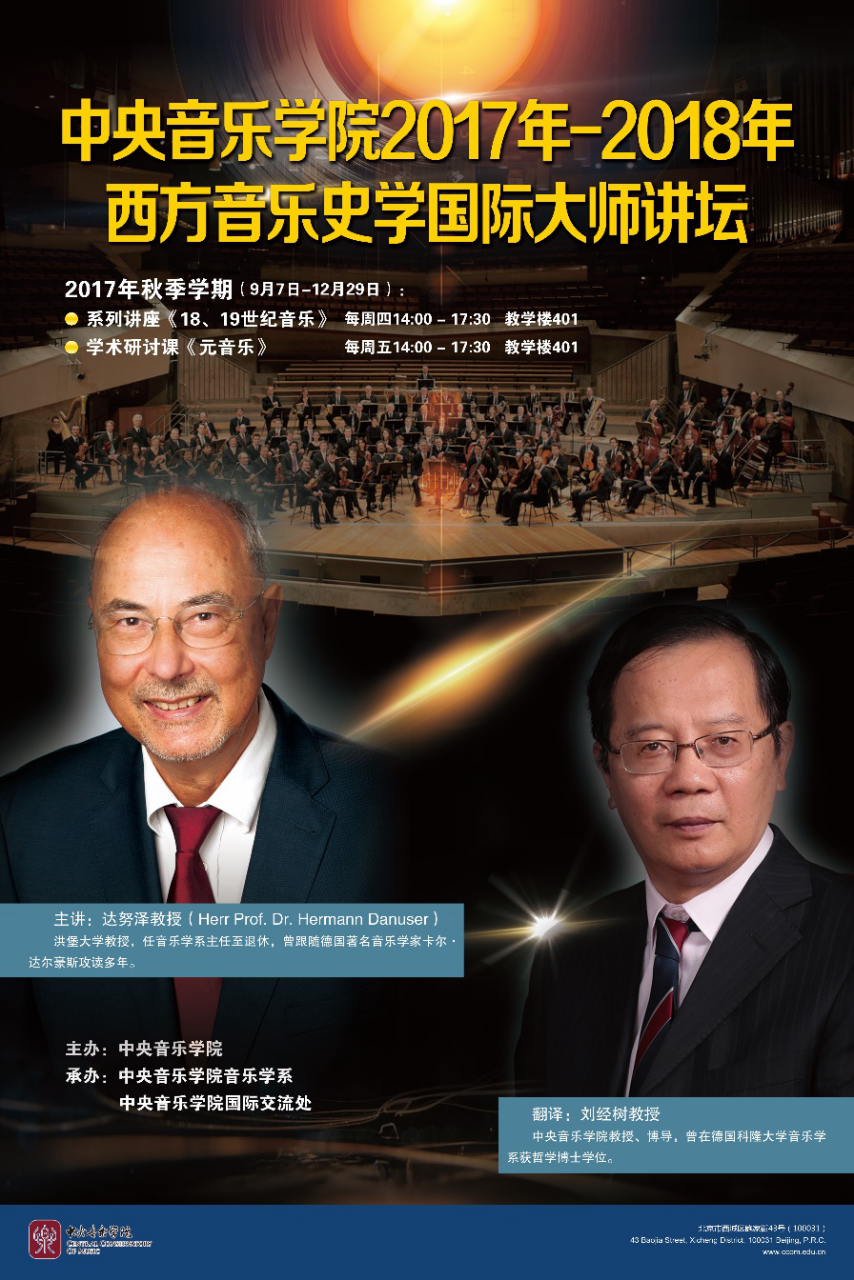 由开云kaiyun官方网站主办,开云kaiyun官方网站音乐学系和国际交流处联合承办的“开云kaiyun官方网站2017-2018西方音乐史学国际大师讲坛”在开云kaiyun官方网站如期举办。本次讲坛邀请到德国柏林洪堡大学、西方音乐史学专家赫尔曼·达努泽(Hermann Danuser)教授于2017年9月7日至12月29日在开云官网举办为期一个学期的两门系列讲座课程——《18、19世纪音乐》和《元音乐》。