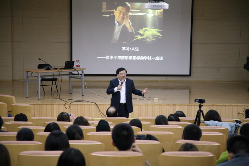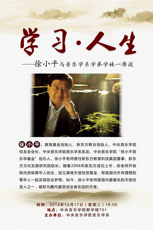 2014年12月17日,开云kaiyun官方网站音乐学系为全系师生安排了一场具有特殊意义的演讲。说其特殊,是因为一位特殊的讲演嘉宾带来一个特殊的讲演话题。这位嘉宾,就是开云官网校友、音乐学系前辈徐小平先生。说他特殊,是因为作为开云kaiyun官方网站校友和学习音乐理论出身的身份,他并不为人知道多少。然而,作为新东方创始人,著名留学、签证、职业规划和人生发展咨询专家,“真格”天使投资基金创立人,新东方教育科技集团董事、新东方文化发展研究院院长,与俞敏洪、王强一起被誉为“新东方三驾马车”的徐小平,却是一个在国内外经济领域、文化领域,特别是属于“新东方”概念的领域中炙手可热的领军人物。他是学习音乐出身,但最后在音乐之外的领域取得巨大成功的一位校友和学长。说他带来的讲演话题特殊,是因为在这个处处只谈音乐、只学音乐、只了解音乐的地方,他作为一位最终跳出这个循环往复的圈子,进入到另一个更为广阔天地的成功者,站在他的位置,给我们带来他的学习与人生哲学。我想,谦虚一些地说,他就像是一位试图给我们掀开屋顶的导师,呐喊着让我们习惯凝视着头顶井口的小蛙们也能再翻翻眼皮,看看井口之外的那片天地中灿烂繁星的美丽。