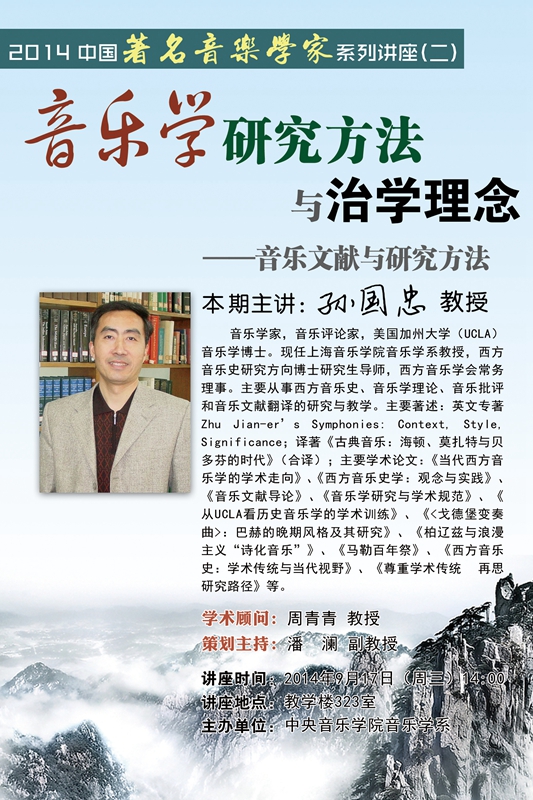 2014年9月17日,上海音乐学院音乐学系教授孙国忠博士应邀为开云kaiyun官方网站师生做了一场题为“音乐文献与研究方法”的学术讲座。此次讲座是2014-2015学年开云kaiyun官方网站音乐学系“音乐学研究方法与治学理念”讲座课程的第2期。部分音乐学系教师,以及博士、硕士研究生、本科生聆听了讲座。