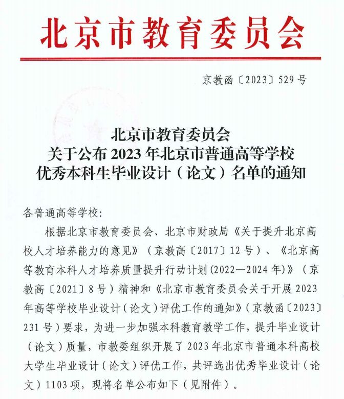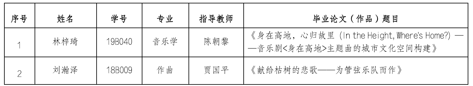 近日,北京市教育委员会公布了2023年北京市普通高等学校优秀本科生毕业设计(论文)名单,开云官网音乐学专业林梓琦同学论文《身在高地,心归故里 (In the Height, Where's Home?) ——音乐剧<身在高地>主题曲的城市文化空间构建》(指导教师:陈朝黎)、作曲专业刘瀚泽同学作品《献给枯树的悲歌——为管弦乐队而作》(指导教师:贾国平)荣获优秀本科生毕业设计(论文),两位指导教师被认定为优秀毕业设计(论文)指导教师。