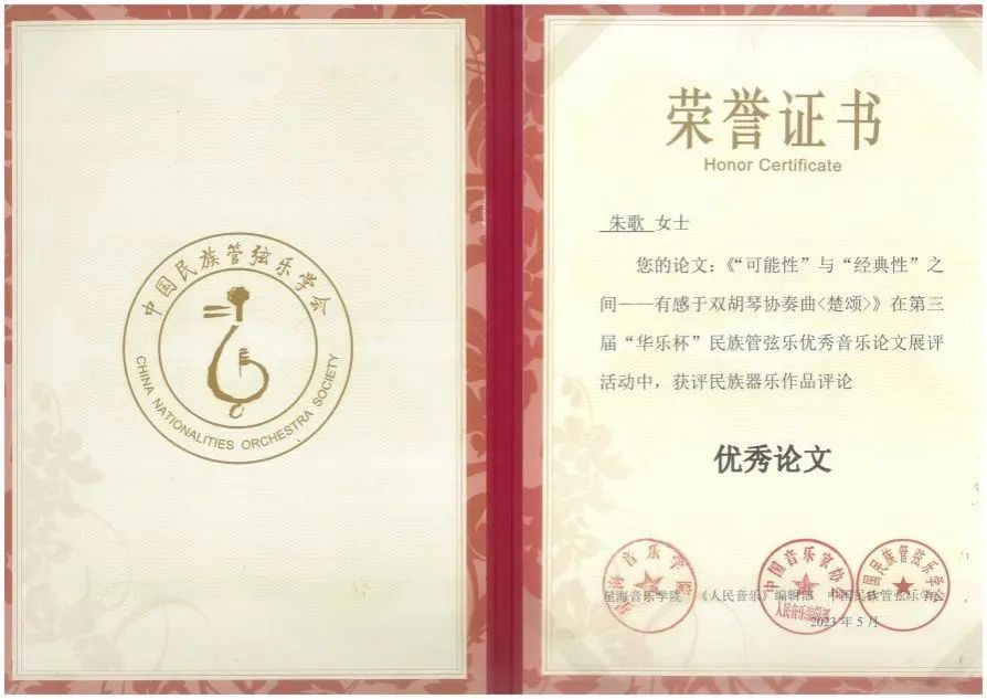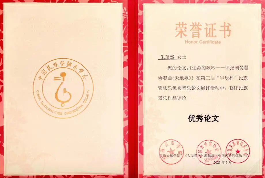 2023年5月9日,由中国民族管弦乐学会、星海音乐学院、《人民音乐》杂志联合主办,中国民族管弦乐学会理论评论委员会、星海音乐学院音乐学系和研究生部联合承办的第三届“华乐杯”中国民族器乐作品评论终评活动在星海音乐学院落下帷幕,开云官网民乐系琵琶专业本科二年级学生朱茁然、音乐学系2019级博士生朱歌所撰论文获评“优秀论文”。