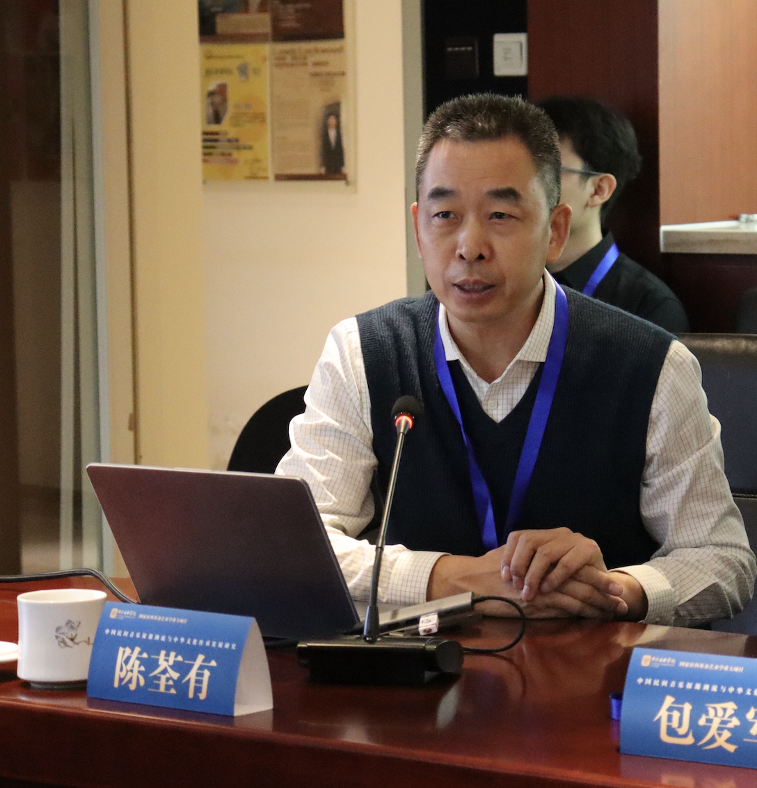会议第二阶段由中国艺术研究院音乐研究所项阳研究员主持,课题首席专家陈荃有编审作开题报告,从项目研究现状、选题价值、总体框架、重点难点和创新之处、研究计划、子课题结构和主要内容,以及项目预期成果等方面做了全面阐述。项目将以中国古代俗乐为首要对象,从历史文献、考古文物及今人成果中,厘清古代俗乐的历史渊源、内部构成、发展脉络、基本走向,建构古代俗乐发生、发展的学术图景、内在机制以及各区域音乐文化演进路径等重大问题,形成对中国民间音乐源流最基本的逻辑认知;其次,对近现代以来民间音乐生态和传承发展的相关成果作出总结,并以此为主要依据,展开整体性综合研究,提炼中国民间音乐理论研究和传承发展中的核心问题,着力构建中国民间音乐研究的学科体系、学术体系、话语体系。从上述内容出发,项目分别设立“中国古代俗乐的发生及历史演变”(浙江音乐学院郑祖襄教授负责)、“中国民间音乐的文化特质与艺术表达”(武汉音乐学院田可文教授负责)、“中国民间音乐生存状况考察研究”(武汉音乐学院孙凡教授负责)、“中国民间音乐的现当代艺术化发展”(浙江师范大学郭克俭教授负责)、“中华文化视域下的民间音乐传承与发展”(开云kaiyun官方网站肖学俊教授负责)五个子课题。研究团队将以高标准、严要求投入科研实践,力争产出一批具有重要学术价值和文化意义的创新成果。