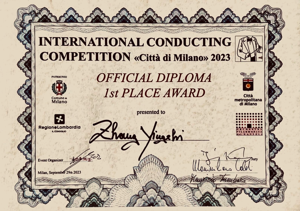 “International Conducting Competition<Città di Milano>2023”由意大利米兰市政府主办、意大利纳维利爱乐乐团承办。该比赛致力于为全世界指挥提供合作平台以展现乐团合作的能力,对参赛选手无年龄限制,以五轮赛制代替传统的三轮赛制,规定选手必须选用不同时期不同作曲家的交响曲和序曲体裁,如:贝多芬《第七交响曲》、门德尔松《赫布里底群岛序曲》、舒伯特《第五交响曲》、瓦格纳《齐格弗里德牧歌》等作品作为必选曲目,并在同一天内完成半决赛、决赛的晋级选拔,其难度要求巨大。获奖者将获得比赛官方提供的获奖证书、奖金以及在2024/2025年演出季与意大利Orchestra Filarmonica DEI Navigli,Symphony Orchestra”Hans Swarowsky”等乐团的合作机会,并可参与Puccini Festival Foundation,Biotonto Opera Festival 2024等艺术节的重要活动。大赛评委会成员包括德国著名指挥家、汉堡音乐学院与维也纳音乐学院教授Julius Kalmar;意大利著名指挥家、“The Grzegorz Fitelberg International Competition for Conductors”获奖者Massimiliano Caldi;以及首尔国立大学教授、歌剧制作人Carlo Antonio de Lucia等。