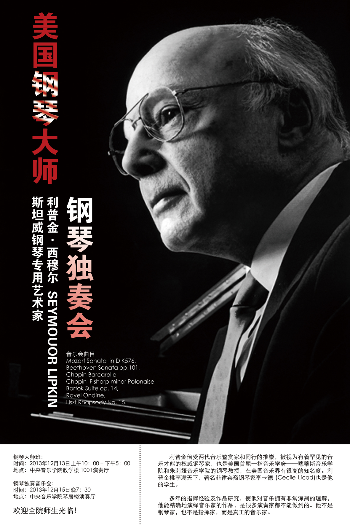 美國鋼琴大師利普金.西莫爾(SEYMOUOR LIPKIN)钢琴独奏会及专家课即将举行