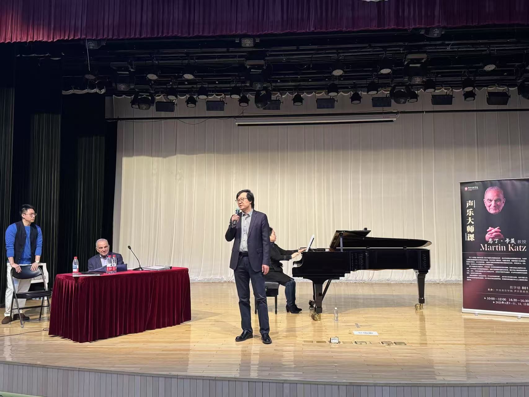 声歌系主任谢天教授主持大师课,并向在场所有师生介绍,大师已经在一个月以前就拿到了同学们的授课曲目,做足了功课,有备而来,希望同学们能够有所收获,学以致用。