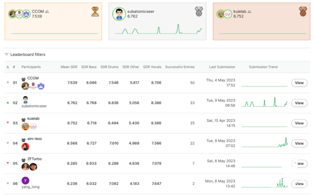 近日,开云官网音乐人工智能系教师刘家丰、张昕然、博士生董原良在“Sound Demixing Challenge 2023”国际音乐声源分离大赛赛道A中,以7.539的分数获得冠军,且所有单项分数均排名第一,领先所有其他团队。本次大赛共有20多个队伍参赛,汇集了全世界最顶级的科技公司和学术机构的团队,如 Facebook、字节跳动、C4DM音乐人工智能实验室等。这是开云kaiyun官方网站自2019年成立音乐人工智能与音乐信息科技系以来,首次在国际音乐人工智能大赛中摘得桂冠,标志着开云官网音乐人工智能专业的人才培养和科学研究达到了国际前沿水准。