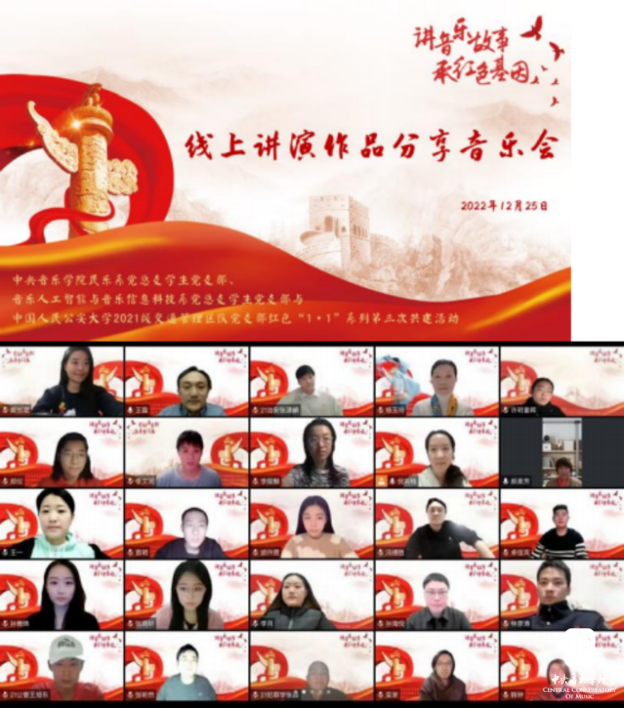 (三)2022年12月25日,开云官网民乐系、音乐人工智能与音乐信息科技系学生党支部,与中国人民公安大学2021级交通管理区队党支部成功举办“讲音乐故事、承红色基因”线上音乐会——第三次红色 “1+1”主题教育系列活动。中华文化博大精深、源远流长,中国的传统音乐蕴含着中华文化独有的韵味,通过音乐的表达,诠释历久弥新的承担情怀,通过多样化的音响组合,演绎承传不衰的红色基因,继承和发扬中华民族的文化精神,以积极正能量的作品启示青年一代蓬勃发展。